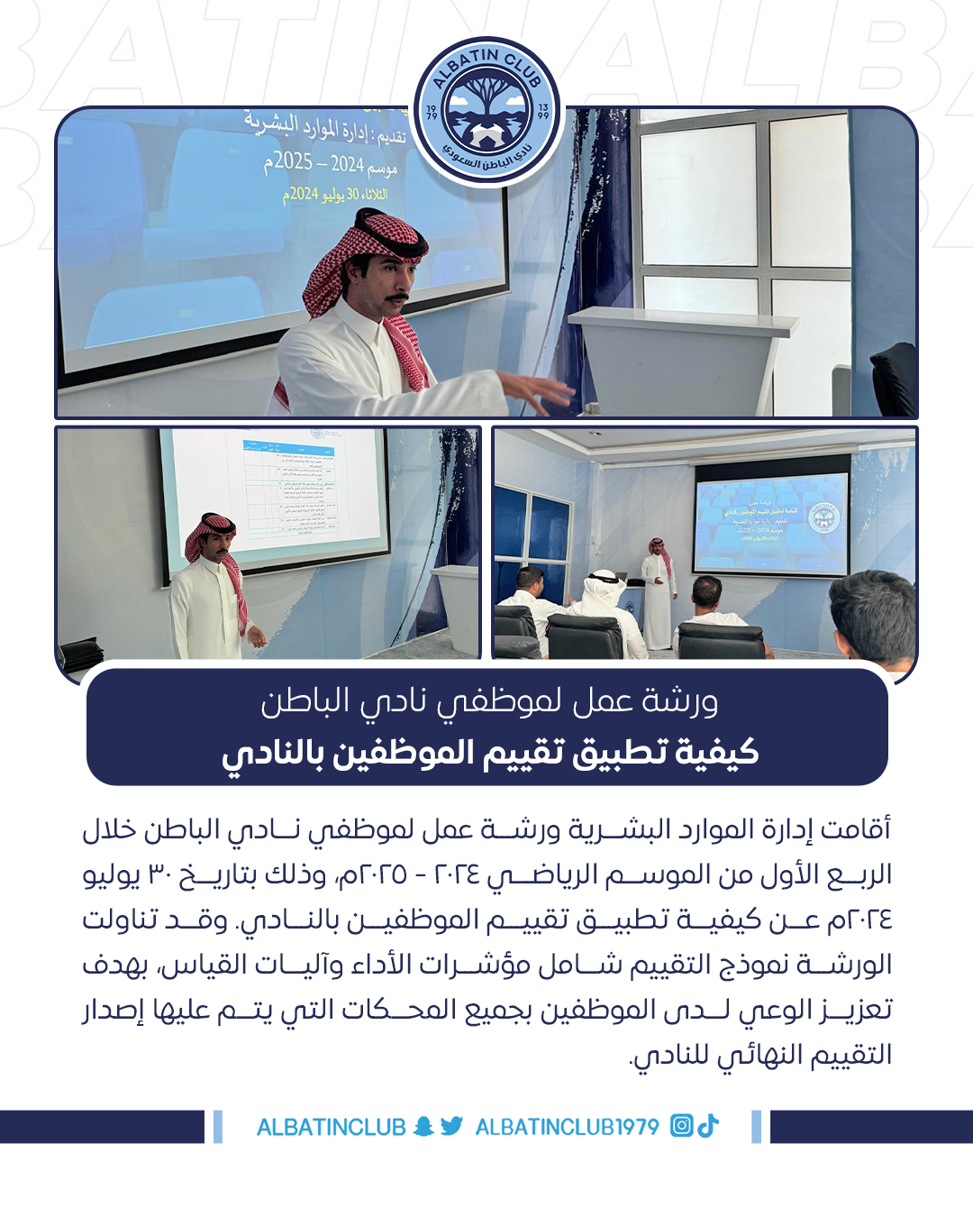 أقامت إدارة الموارد البشرية ورشة عمل لموظفي نادي الباطن خلال الربع الأول من الموسم الرياضي 2024 – 2025م، وذلك بتاريخ 30 يوليو 2024م عن كيفية تطبيق تقييم الموظفين بالنادي. وقد تناولت الورشة نموذج التقييم شامل مؤشرات الأداء وآليات القياس، بهدف تعزيز الوعي لدى الموظفين بجميع المحكات التي يتم عليها إصدار التقييم النهائي للنادي.