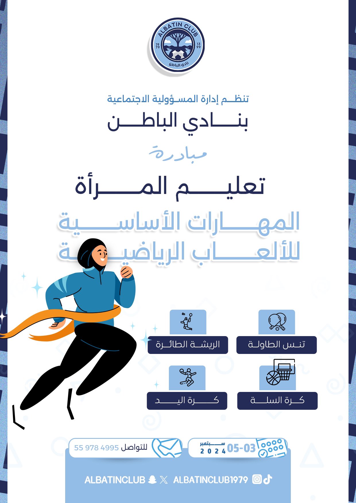 تستعد إدارة المسؤولية الاجتماعية بنادي #الباطن لتنظيم مبادرة ( تعليم المرأة المهارات الأساسية في الألعاب الرياضية “تنس طاولة – ريشة طائرة – كرة السلة – كرة اليد ) في الفترة من 3 – 5 سبتمبر 2024م.