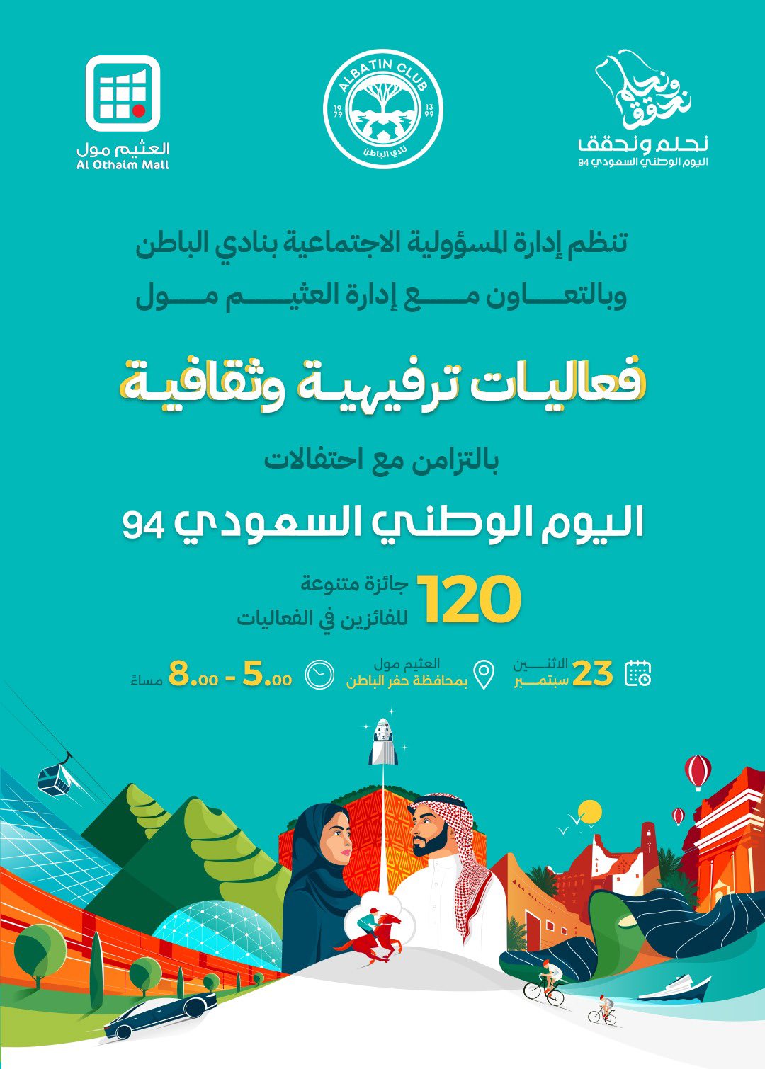 تنظم إدارة المسؤولية الاجتماعية بالنادي، وبالتعاون مع إدارة العثيم مول فعاليات ترفيهية وثقافية بالتزامن مع احتفالات اليوم الوطني 🇸🇦 “94” الموافق الاثنين 23 سبتمبر 2024م بمقر العثيم مول بمحافظة حفرالباطن