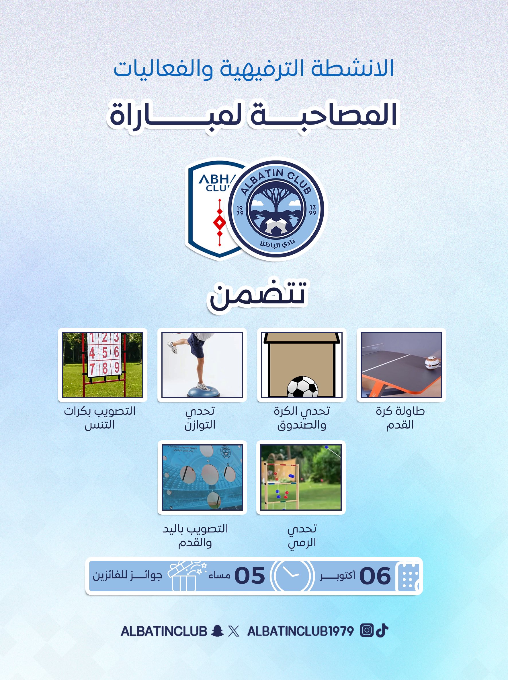 الانشطة الترفيهية والفعاليات المصاحبة لمباراة الباطن – أبها 6 أكتوبر، 2024 / اخبار النادي, الفعاليات, المسؤولية الإجتماعية Share via: Facebook X (Twitter) LinkedIn More