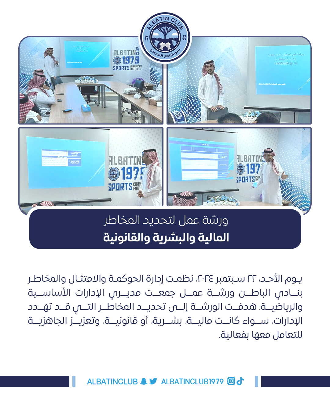 يوم الأحد، 22 سبتمبر 2024، نظمت إدارة الحوكمة والامتثال والمخاطر بنادي الباطن ورشة عمل جمعت مديري الإدارات الأساسية والرياضية. هدفت الورشة إلى تحديد المخاطر التي قد تهدد الإدارات، سواء كانت مالية، بشرية، أو قانونية، وتعزيز الجاهزية للتعامل معها بفعالية.