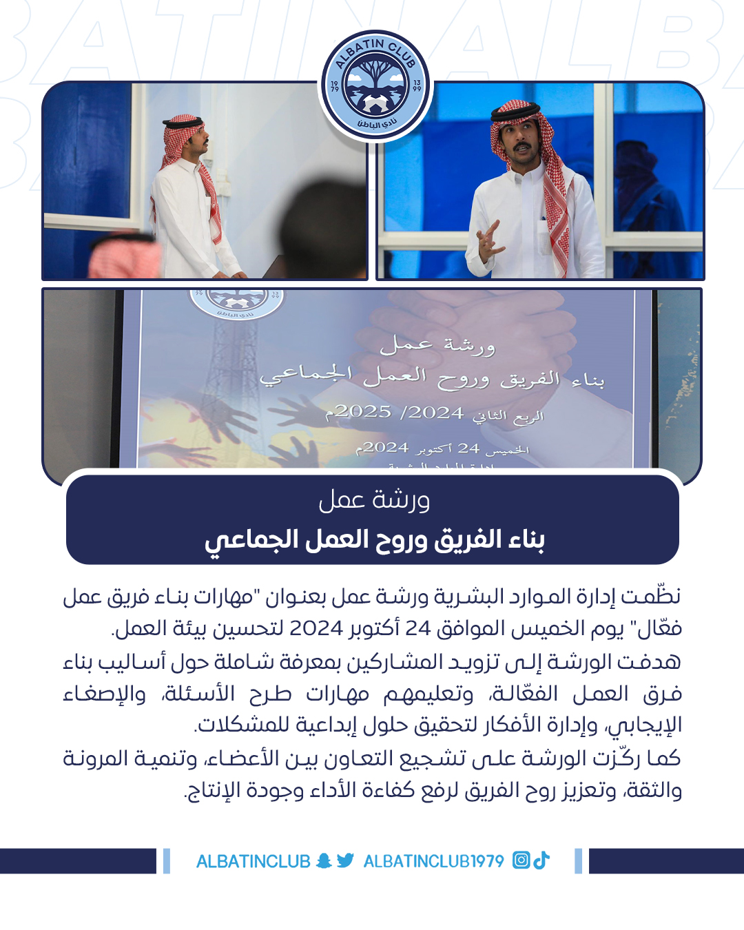 نظّمت إدارة الموارد البشرية ورشة عمل بعنوان “مهارات بناء فريق عمل فعّال” يوم الخميس الموافق 24 أكتوبر 2024 لتحسين بيئة العمل.
