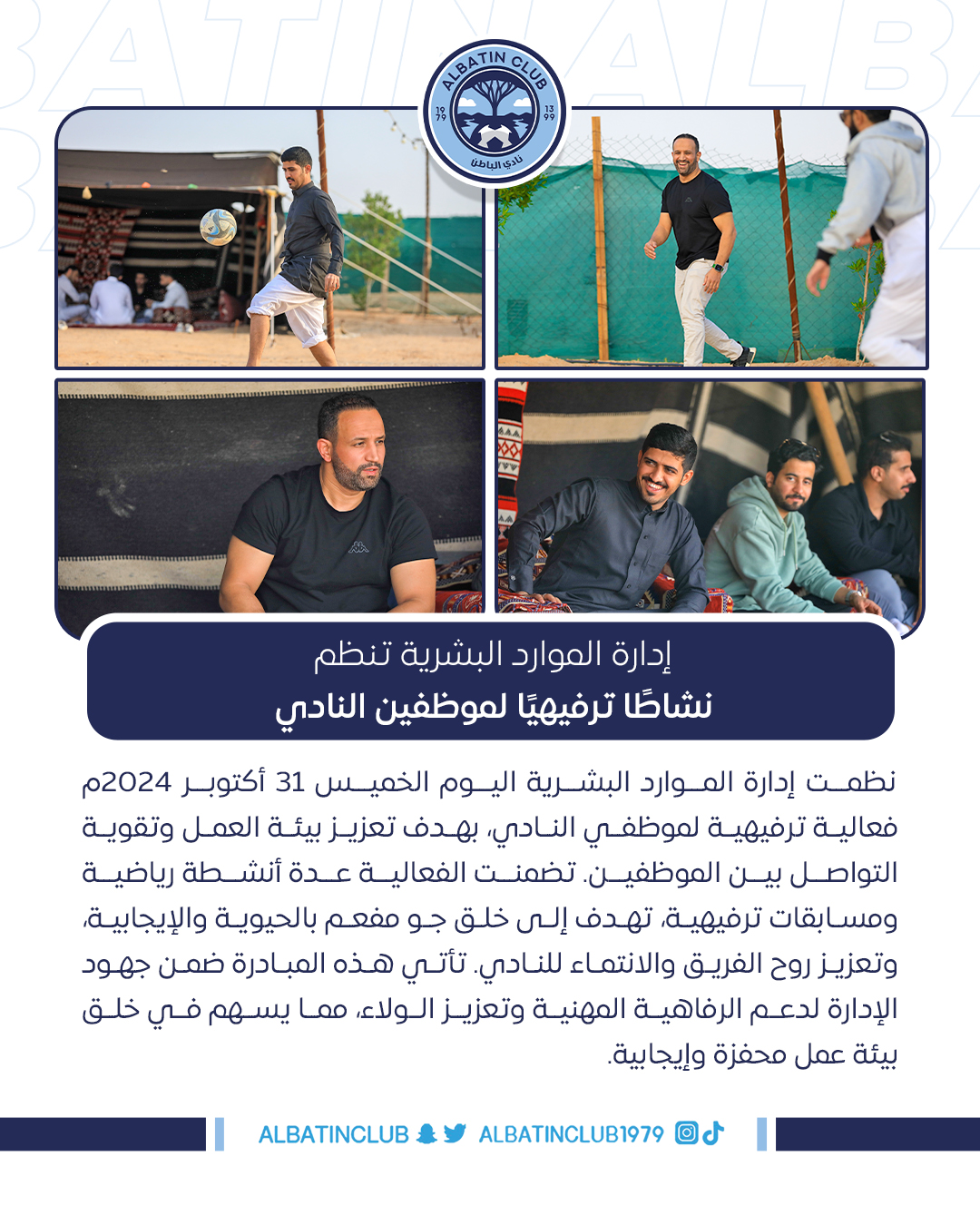 نظمت إدارة الموارد البشرية اليوم الخميس 31 أكتوبر 2024م فعالية ترفيهية لموظفي النادي، بهدف تعزيز بيئة العمل وتقوية التواصل بين الموظفين. تضمنت الفعالية عدة أنشطة رياضية ومسابقات ترفيهية، تهدف إلى خلق جو مفعم بالحيوية والإيجابية، وتعزيز روح الفريق والانتماء للنادي. تأتي هذه المبادرة ضمن جهود الإدارة لدعم الرفاهية المهنية وتعزيز الولاء، مما يسهم في خلق بيئة عمل محفزة وإيجابية.