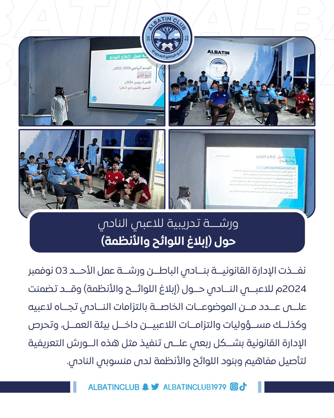 نفذت الإدارة القانونية بنادي الباطن ورشة عمل الأحد 03 نوفمبر 2024م للاعبي النادي حول (إبلاغ اللوائح والأنظمة) وقد تضمنت على عدد من الموضوعات الخاصة بالتزامات النادي تجاه لاعبيه وكذلك مسؤوليات والتزامات اللاعبين داخل بيئة العمل، وتحرص الإدارة القانونية بشكل ربعي على تنفيذ مثل هذه الورش التعريفية لتأصيل مفاهيم وبنود اللوائح والأنظمة لدى منسوبي النادي.