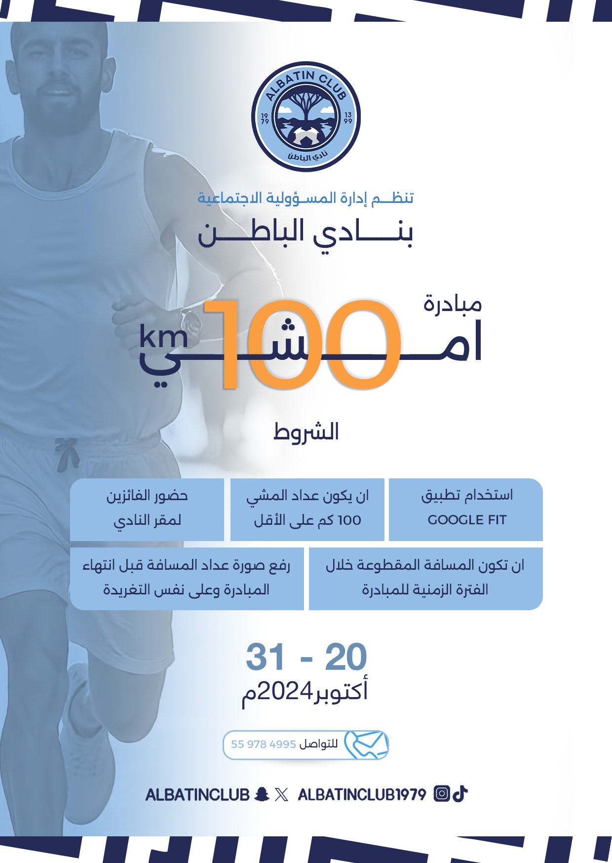 فعاليات تنفيذ مبادرة امشي ١٠٠ كم 🏃♂️🏃♀️ والتي نظمتها إدارة المسؤولية الاجتماعية بنادي #الباطن من ٢٠ إلى ٣١ أكتوبر ٢٠٢٤م والتي استهدفت تحقيق تحول في نمط الحياة اليومية بشكل إيجابي تجاه الصحة البدنية.