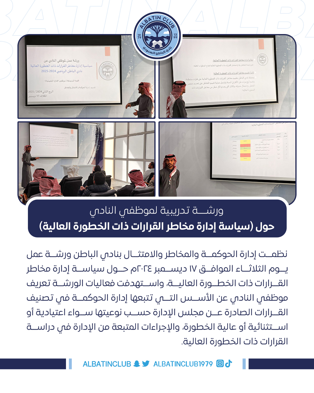 نظمت إدارة الحوكمة والمخاطر والامتثال بنادي الباطن ورشة عمل يوم الثلاثاء الموافق 17 ديسمبر 2024م حول سياسة إدارة مخاطر القرارات ذات الخطورة العالية، واستهدفت فعاليات الورشة تعريف موظفي النادي عن الأسس التي تتبعها إدارة الحوكمة في تصنيف القرارات الصادرة عن مجلس الإدارة حسب نوعيتها سواء اعتيادية أو استثنائية أو عالية الخطورة، والإجراءات المتبعة من الإدارة في دراسة القرارات ذات الخطورة العالية.