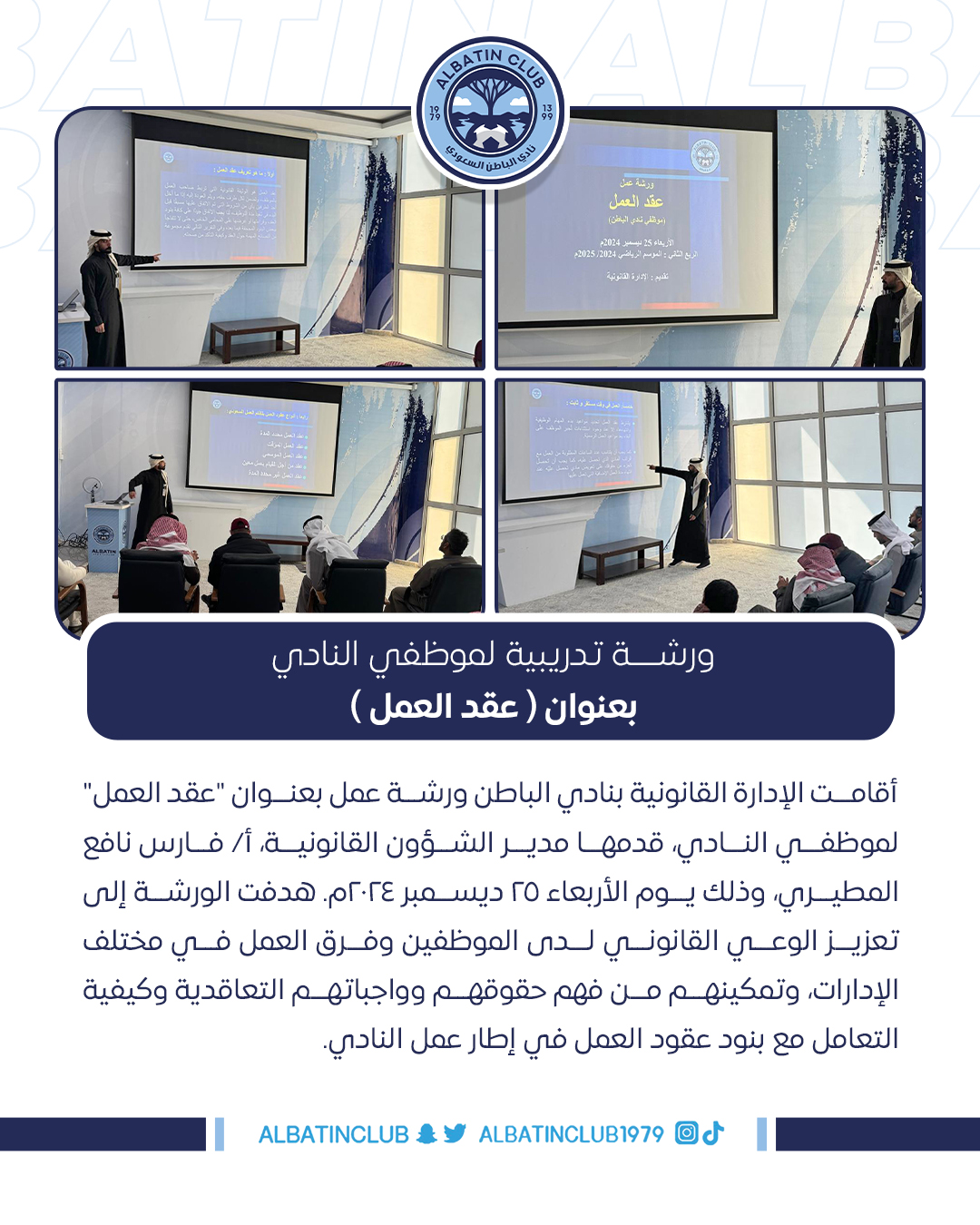 أقامت الإدارة القانونية بنادي الباطن ورشة عمل بعنوان “عقد العمل” لموظفي النادي، قدمها مدير الشؤون القانونية، أ/ فارس نافع المطيري، وذلك يوم الأربعاء 25 ديسمبر 2024م. هدفت الورشة إلى تعزيز الوعي القانوني لدى الموظفين وفرق العمل في مختلف الإدارات، وتمكينهم من فهم حقوقهم وواجباتهم التعاقدية وكيفية التعامل مع بنود عقود العمل في إطار عمل النادي.