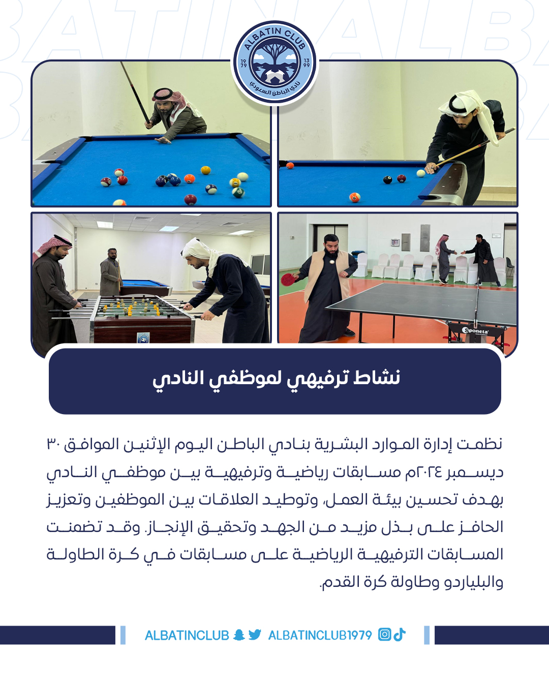 نظمت إدارة الموارد البشرية بنادي الباطن اليوم الإثنين الموافق 30 ديسمبر 2024م مسابقات رياضية وترفيهية بين موظفي النادي بهدف تحسين بيئة العمل، وتوطيد العلاقات بين الموظفين وتعزيز الحافز على بذل مزيد من الجهد وتحقيق الإنجاز. وقد تضمنت المسابقات الترفيهية الرياضية على مسابقات في كرة الطاولة والبلياردو وطاولة كرة القدم