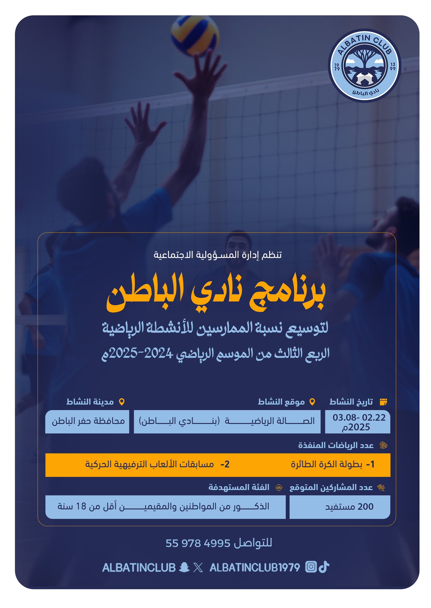 فعالية بطولة الكرة الطائرة ضمن برنامج نادي الباطن خلال الربع الثالث من الموسم الرياضي 2024/ 2025م 7 يناير، 2025 / اخبار النادي, الفئات السنية, الفعاليات, المسؤولية الإجتماعية لزيادة نسبة الممارسين للرياضة، نسعد بمشاركة للذكور أقل من ١٨ سنة وجوائز قيّمة للفائزين. Share via: Facebook X (Twitter) LinkedIn More
