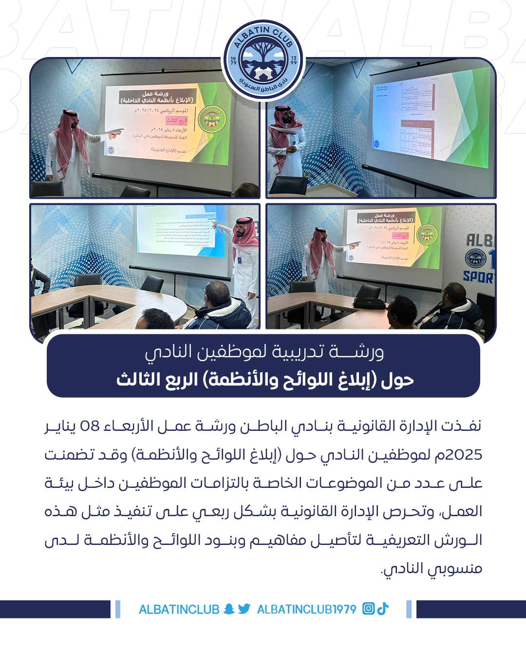 نفذت الإدارة القانونية بنادي الباطن ورشة عمل الأربعاء 08 يناير 2025م لموظفين النادي حول (إبلاغ اللوائح والأنظمة) وقد تضمنت على عدد من الموضوعات الخاصة بالتزامات الموظفين داخل بيئة العمل، وتحرص الإدارة القانونية بشكل ربعي على تنفيذ مثل هذه الورش التعريفية لتأصيل مفاهيم وبنود اللوائح والأنظمة لدى منسوبي النادي.