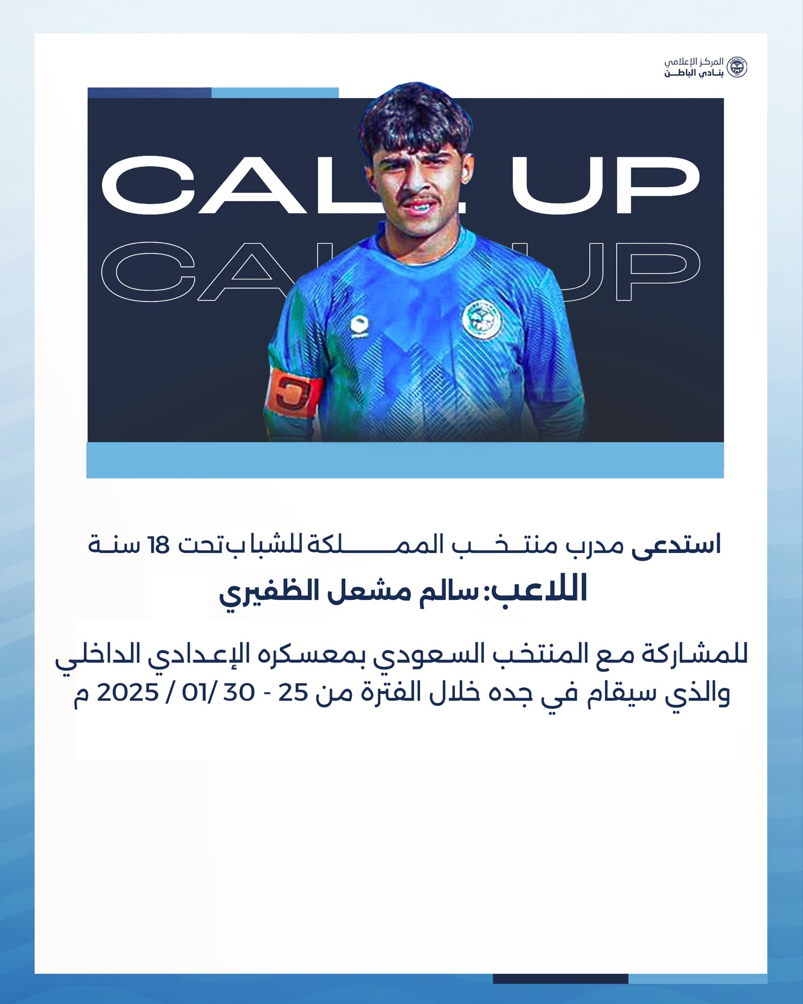 مدرب منتخب المملكة للشباب تحت 18 سنة يستدعي لاعب الباطن سالم الظفيري للإنضمام لمعسكر المنتخب 15 يناير، 2025 / اخبار النادي, الالعاب المختلفة, الفئات السنية Share via: Facebook X (Twitter) LinkedIn More