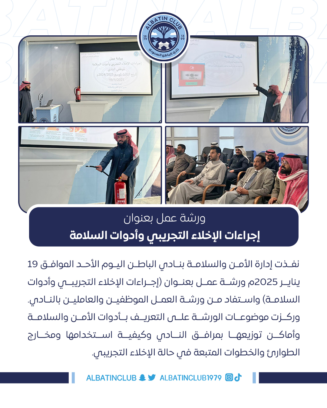 نفذت إدارة الأمن والسلامة بنادي الباطن اليوم الأحد الموافق 19 يناير 2025م ورشة عمل بعنوان (إجراءات الإخلاء التجريبي وأدوات السلامة) واستفاد من ورشة العمل الموظفين والعاملين بالنادي. وركزت موضوعات الورشة على التعريف بأدوات الأمن والسلامة وأماكن توزيعها بمرافق النادي وكيفية استخدامها ومخارج الطوارئ والخطوات المتبعة في حالة الإخلاء التجريبي.