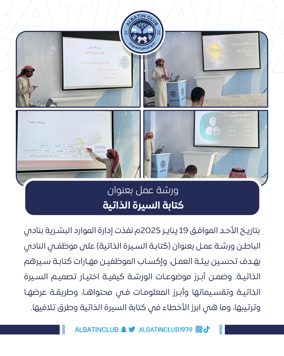 بتاريخ الأحد الموافق 19 يناير 2025م نفذت إدارة الموارد البشرية بنادي الباطن ورشة عمل بعنوان (كتابة السيرة الذاتية) على موظفي النادي بهدف تحسين بيئة العمل، وإكساب الموظفين مهارات كتابة سيرهم الذاتية. وضمن أبرز موضوعات الورشة كيفية اختيار تصميم السيرة الذاتية وتقسيماتها وأبرز المعلومات في محتواها، وطريقة عرضها وترتيبها، وما هي ابرز الأخطاء في كتابة السيرة الذاتية وطرق تلافيها.