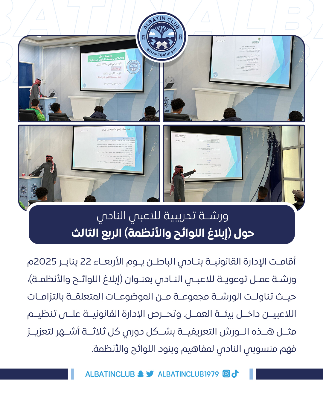 أقامت الإدارة القانونية بنادي الباطن يوم الأربعاء 22 يناير 2025م ورشة عمل توعوية للاعبي النادي بعنوان (إبلاغ اللوائح والأنظمة)، حيث تناولت الورشة مجموعة من الموضوعات المتعلقة بالتزامات اللاعبين داخل بيئة العمل. وتحرص الإدارة القانونية على تنظيم مثل هذه الورش التعريفية بشكل دوري كل ثلاثة أشهر لتعزيز فهم منسوبي النادي لمفاهيم وبنود اللوائح والأنظمة.