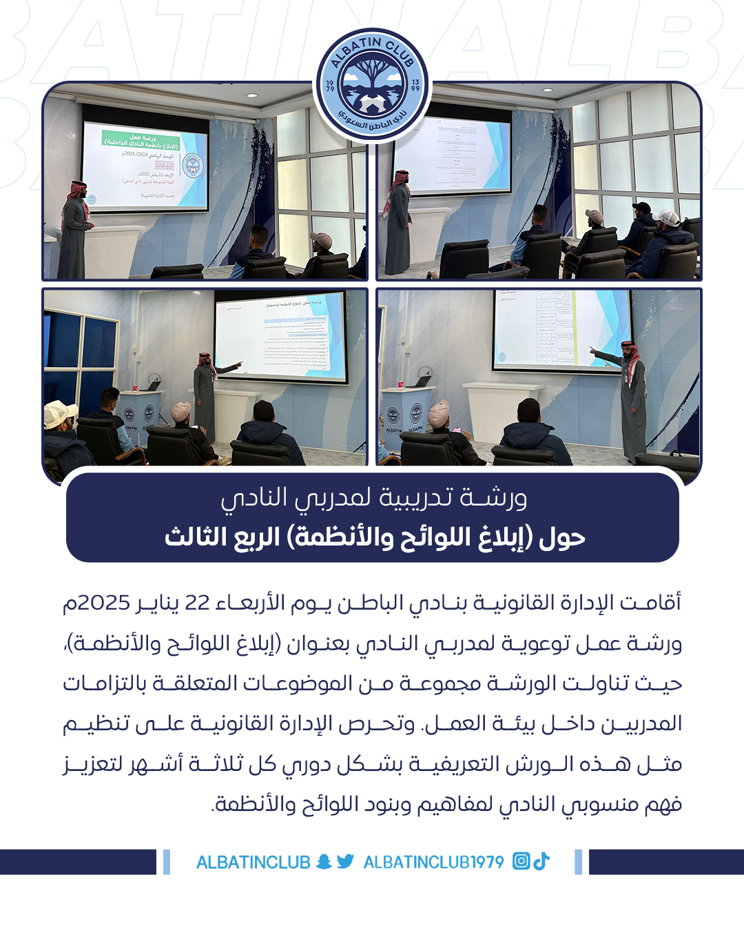 أقامت الإدارة القانونية بنادي الباطن يوم الأربعاء 22 يناير 2025م ورشة عمل توعوية لمدربي النادي بعنوان (إبلاغ اللوائح والأنظمة)، حيث تناولت الورشة مجموعة من الموضوعات المتعلقة بالتزامات المدربين داخل بيئة العمل. وتحرص الإدارة القانونية على تنظيم مثل هذه الورش التعريفية بشكل دوري كل ثلاثة أشهر لتعزيز فهم منسوبي النادي لمفاهيم وبنود اللوائح والأنظمة.