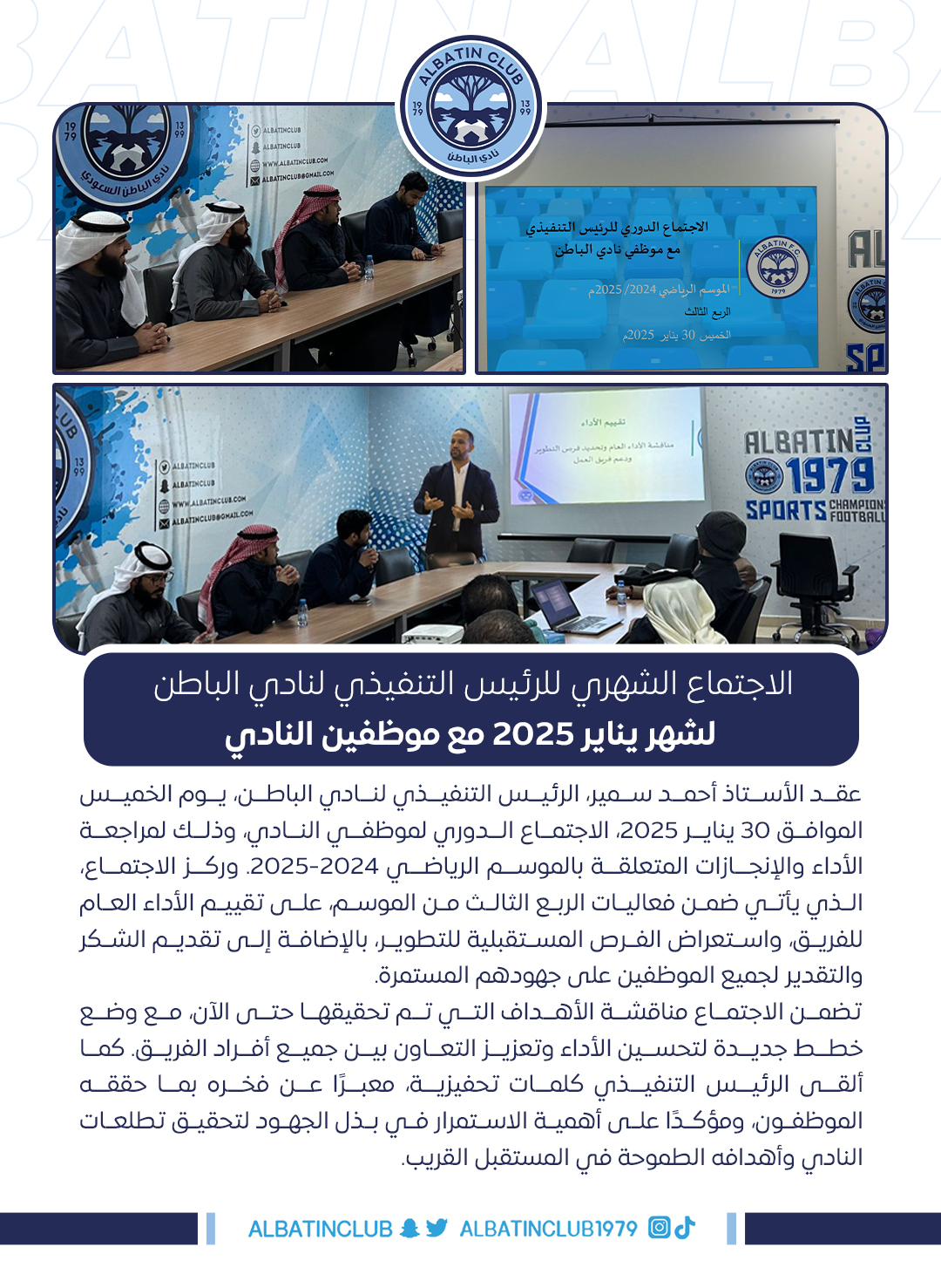 عقد الأستاذ أحمد سمير، الرئيس التنفيذي لنادي الباطن، يوم الخميس الموافق 30 يناير 2025، الاجتماع الدوري لموظفي النادي، وذلك لمراجعة الأداء والإنجازات المتعلقة بالموسم الرياضي 2024-2025. وركز الاجتماع، الذي يأتي ضمن فعاليات الربع الثالث من الموسم، على تقييم الأداء العام للفريق، واستعراض الفرص المستقبلية للتطوير، بالإضافة إلى تقديم الشكر والتقدير لجميع الموظفين على جهودهم المستمرة.