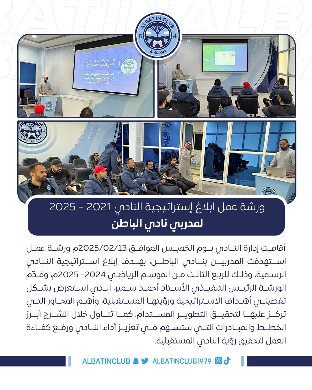 أقامت إدارة النادي يوم الخميس الموافق 13/02/2025م ورشة عمل استهدفت المدربين بنادي الباطن، بهدف إبلاغ استراتيجية النادي الرسمية، وذلك للربع الثالث من الموسم الرياضي 2024- 2025م، وقدّم الورشة الرئيس التنفيذي الأستاذ أحمد سمير، الذي استعرض بشكل تفصيلي أهداف الاستراتيجية ورؤيتها المستقبلية، وأهم المحاور التي تركز عليها لتحقيق التطوير المستدام. كما تناول خلال الشرح أبرز الخطط والمبادرات التي ستسهم في تعزيز أداء النادي ورفع كفاءة العمل لتحقيق رؤية النادي المستقبلية.