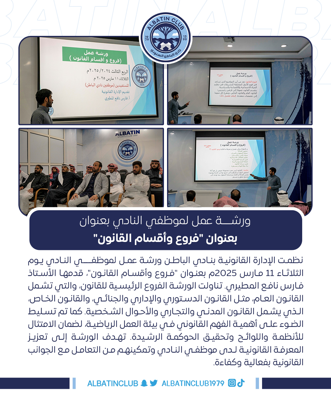 نظمت الإدارة القانونية بنادي الباطن ورشة عمل لموظفــــي النادي يوم الثلاثاء 11 مارس 2025م بعنوان “فروع وأقسام القانون”، قدمها الأستاذ فارس نافع المطيري. تناولت الورشة الفروع الرئيسية للقانون، والتي تشمل القانون العام، مثل القانون الدستوري والإداري والجنائي، والقانون الخاص، الذي يشمل القانون المدني والتجاري والأحوال الشخصية. كما تم تسليط الضوء على أهمية الفهم القانوني في بيئة العمل الرياضية، لضمان الامتثال للأنظمة واللوائح وتحقيق الحوكمة الرشيدة. تهدف الورشة إلى تعزيز المعرفة القانونية لدى موظفي النادي وتمكينهم من التعامل مع الجوانب القانونية بفعالية وكفاءة.