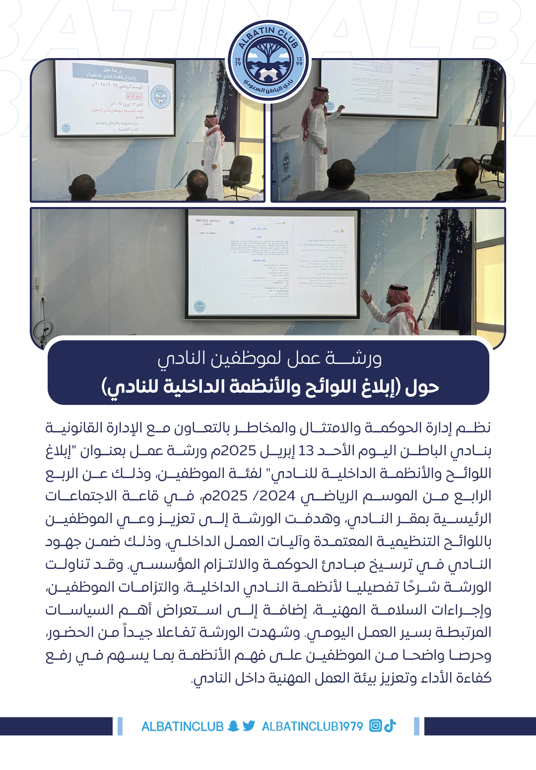 نظم إدارة الحوكمة والامتثال والمخاطر بالتعاون مع الإدارة القانونية بنادي الباطن اليوم الأحد 13 إبريل 2025م ورشة عمل بعنوان “إبلاغ اللوائح والأنظمة الداخلية للنادي” لفئة الموظفين، وذلك عن الربع الرابع من الموسم الرياضي 2024/ 2025م، في قاعة الاجتماعات الرئيسية بمقر النادي، وهدفت الورشة إلى تعزيز وعي الموظفين باللوائح التنظيمية المعتمدة وآليات العمل الداخلي، وذلك ضمن جهود النادي في ترسيخ مبادئ الحوكمة والالتزام المؤسسي. وقد تناولت الورشة شرحًا تفصيليا لأنظمة النادي الداخلية، والتزامات الموظفين، وإجراءات السلامة المهنية، إضافة إلى استعراض أهم السياسات المرتبطة بسير العمل اليومي. وشهدت الورشة تفاعلا جيداً من الحضور، وحرصا واضحا من الموظفين على فهم الأنظمة بما يسهم في رفع كفاءة الأداء وتعزيز بيئة العمل المهنية داخل النادي.