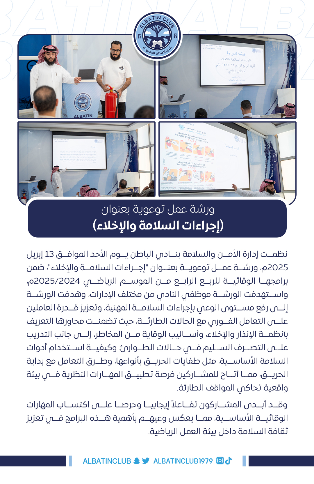 نظمت إدارة الأمن والسلامة بنادي الباطن يوم الأحد الموافق 13 إبريل 2025م، ورشة عمل توعوية بعنوان “إجراءات السلامة والإخلاء”، ضمن برامجها الوقائية للربع الرابع من الموسم الرياضي 2024/2025م، واستهدفت الورشة موظفي النادي من مختلف الإدارات، وهدفت الورشة إلى رفع مستوى الوعي بإجراءات السلامة المهنية، وتعزيز قدرة العاملين على التعامل الفوري مع الحالات الطارئة، حيث تضمنت محاورها التعريف بأنظمة الإنذار والإخلاء، وأساليب الوقاية من المخاطر، إلى جانب التدريب على التصرف السليم في حالات الطوارئ. وكيفية استخدام أدوات السلامة الأساسية، مثل طفايات الحريق بأنواعها، وطرق التعامل مع بداية الحريق، مما أتاح للمشاركين فرصة تطبيق المهارات النظرية في بيئة واقعية تحاكي المواقف الطارئة.