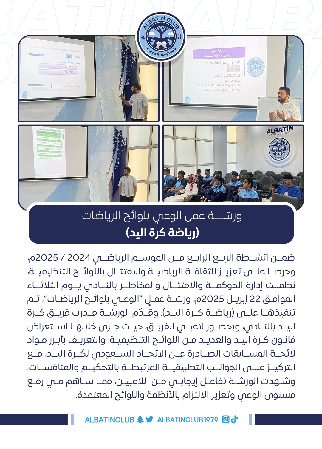 ضمن أنشطة الربع الرابع من الموسم الرياضي 2024 / 2025م، وحرصا على تعزيز الثقافة الرياضية والامتثال باللوائح التنظيمية، نظمت إدارة الحوكمة والامتثال والمخاطر بالنادي يوم الثلاثاء الموافق 22 إبريل 2025م، ورشة عملٍ “الوعي بلوائح الرياضات”، تم تنفيذها على (رياضة كرة اليد). وقدّم الورشة مدرب فريق كرة اليد بالنادي، وبحضور لاعبي الفريق، حيث جرى خلالها استعراض قانون كرة اليد والعديد من اللوائح التنظيمية، والتعريف بأبرز مواد لائحة المسابقات الصادرة عن الاتحاد السعودي لكرة اليد، مع التركيز على الجوانب التطبيقية المرتبطة بالتحكيم والمنافسات. وشهدت الورشة تفاعل إيجابي من اللاعبين، مما ساهم في رفع مستوى الوعي وتعزيز الالتزام بالأنظمة واللوائح المعتمدة.