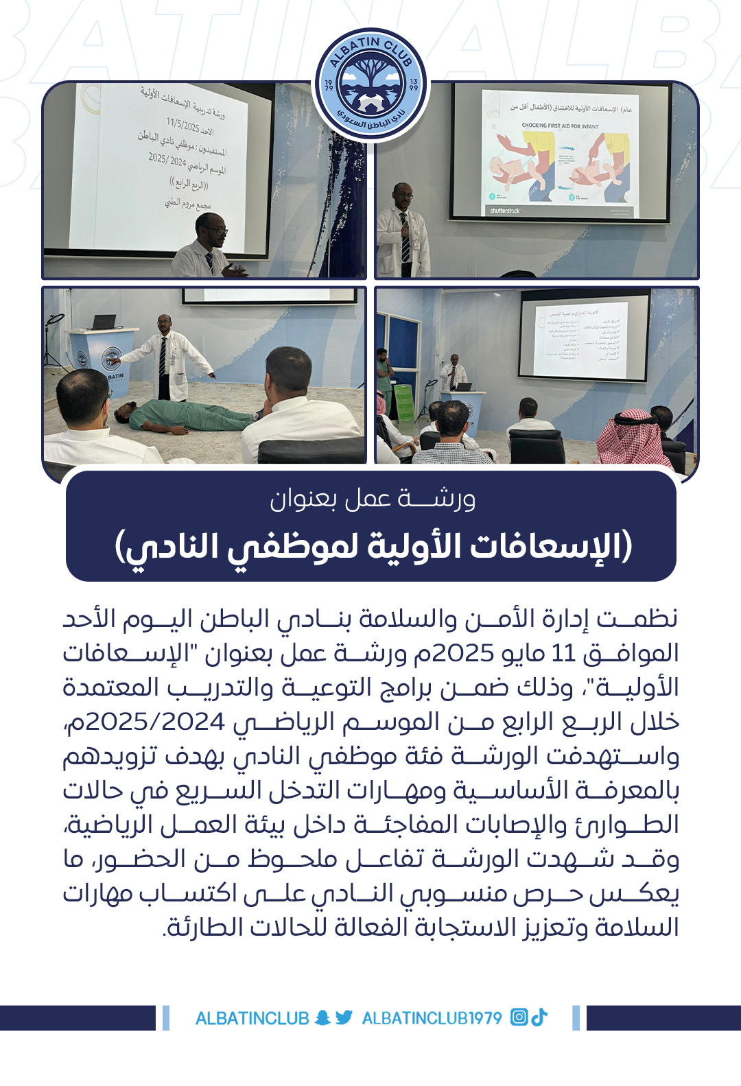 نظمت إدارة الأمن والسلامة بنادي الباطن اليوم الأحد الموافق 11 مايو 2025م ورشة عمل بعنوان “الإسعافات الأولية”، وذلك ضمن برامج التوعية والتدريب المعتمدة خلال الربع الرابع من الموسم الرياضي 2024/2025م، واستهدفت الورشة فئة موظفي النادي بهدف تزويدهم بالمعرفة الأساسية ومهارات التدخل السريع في حالات الطوارئ والإصابات المفاجئة داخل بيئة العمل الرياضية، وقد شهدت الورشة تفاعل ملحوظ من الحضور، ما يعكس حرص منسوبي النادي على اكتساب مهارات السلامة وتعزيز الاستجابة الفعالة للحالات الطارئة.