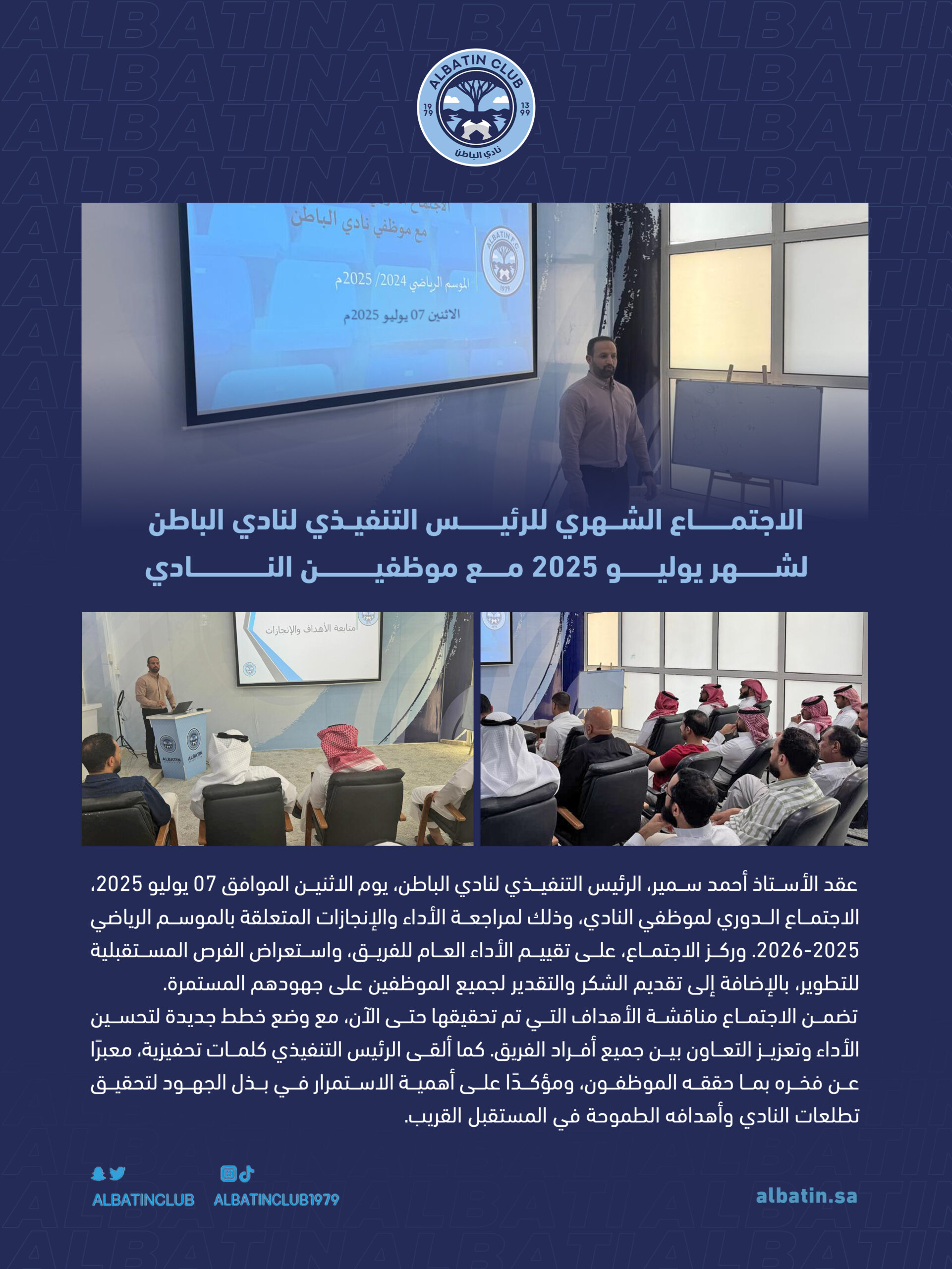 عقد الأستاذ أحمد سمير، الرئيس التنفيذي لنادي الباطن، يوم الاثنين الموافق 07 يوليو 2025، الاجتماع الدوري لموظفي النادي، وذلك لمراجعة الأداء والإنجازات المتعلقة بالموسم الرياضي 2025-2026. وركز الاجتماع، على تقييم الأداء العام للفريق، واستعراض الفرص المستقبلية للتطوير، بالإضافة إلى تقديم الشكر والتقدير لجميع الموظفين على جهودهم المستمرة.