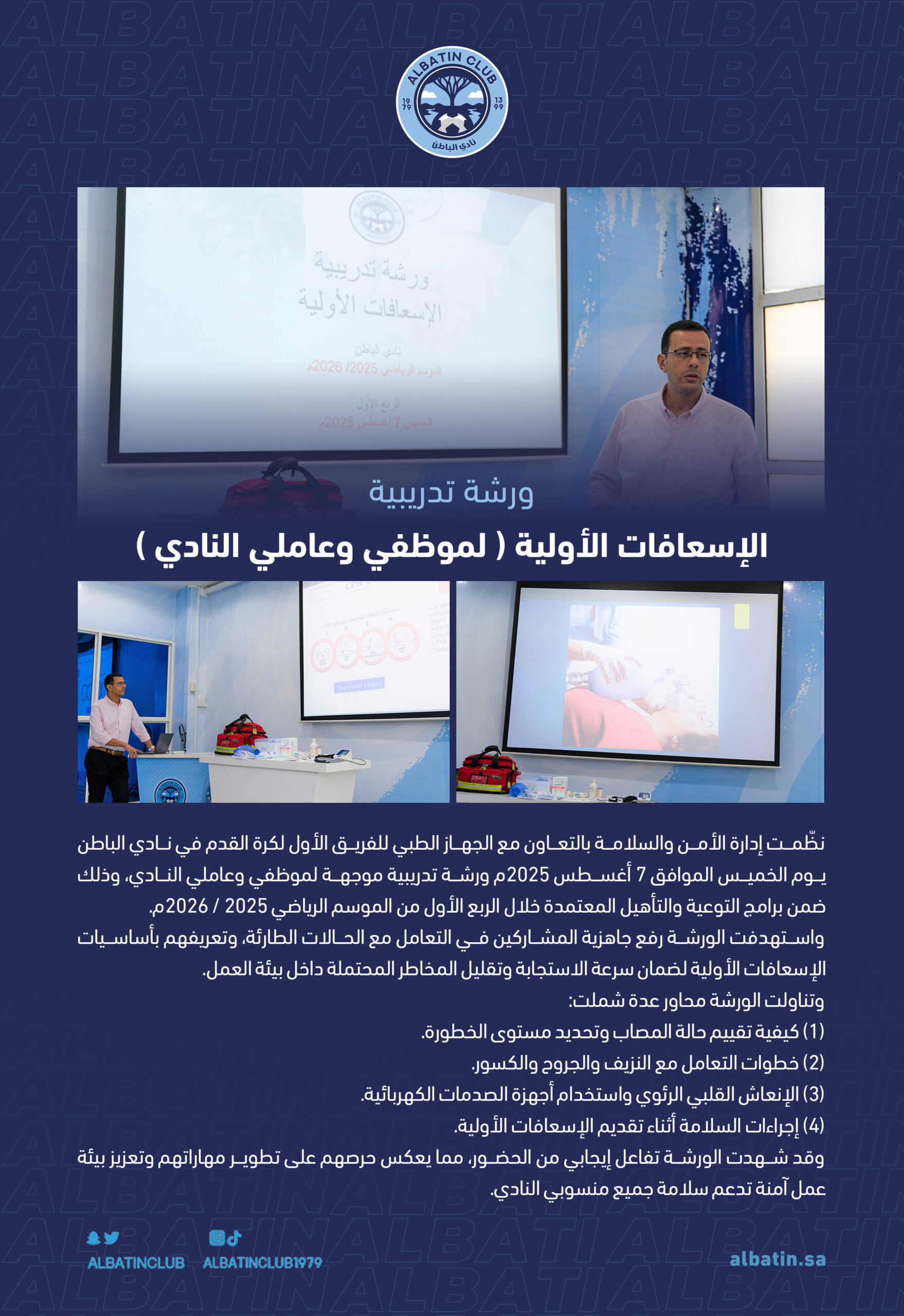 نظّمت إدارة الأمن والسلامة بالتعاون مع الجهاز الطبي للفريق الأول لكرة القدم في نادي الباطن يوم الخميس الموافق 7 أغسطس 2025م ورشة تدريبية موجهة لموظفي وعاملي النادي، وذلك ضمن برامج التوعية والتأهيل المعتمدة خلال الربع الأول من الموسم الرياضي 2025 / 2026م.