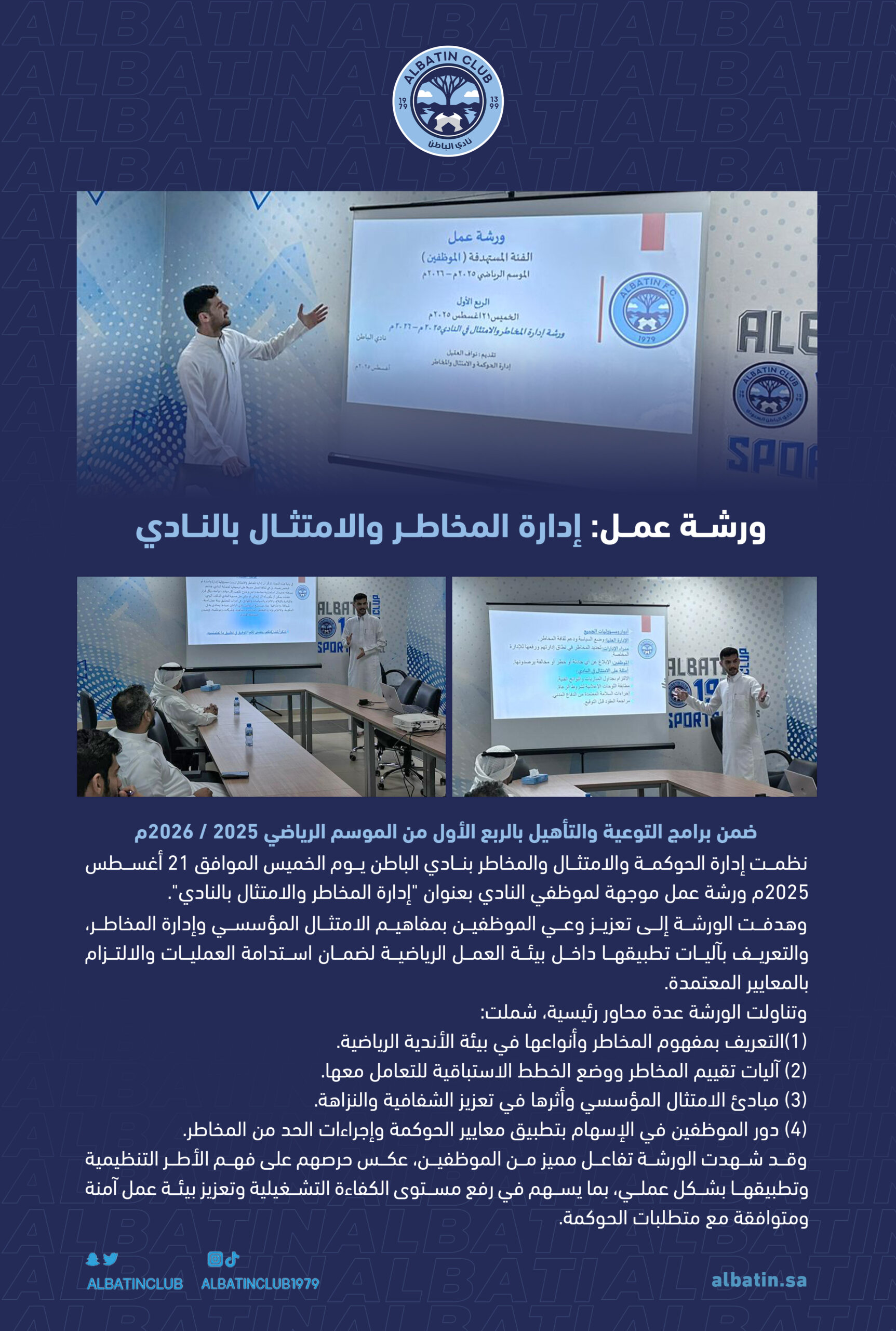 نظمت إدارة الحوكمة والامتثال والمخاطر بنادي الباطن يوم الخميس الموافق 21 أغسطس 2025م ورشة عمل موجهة لموظفي النادي بعنوان “إدارة المخاطر والامتثال بالنادي”.