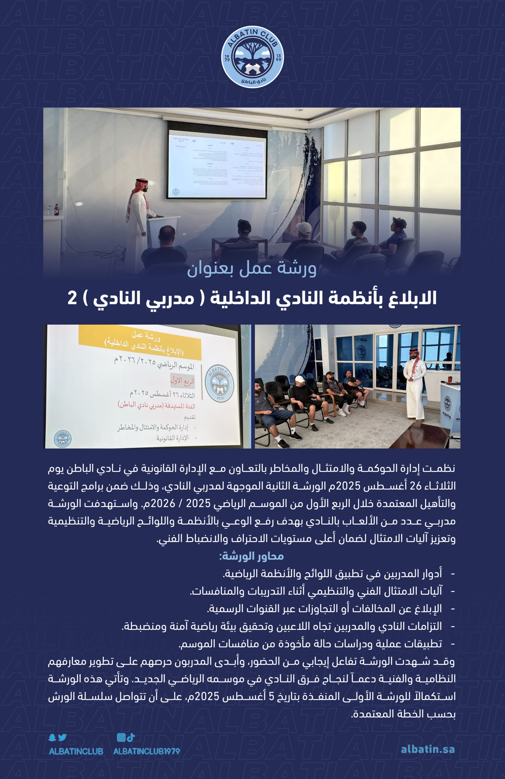 نظمت إدارة الحوكمة والامتثال والمخاطر بالتعاون مع الإدارة القانونية في نادي الباطن يوم الثلاثاء 26 أغسطس 2025م الورشة الثانية الموجهة لمدربي النادي، وذلك ضمن برامج التوعية والتأهيل المعتمدة خلال الربع الأول من الموسم الرياضي 2025 / 2026م. واستهدفت الورشة مدربي عدد من الألعاب بالنادي بهدف رفع الوعي بالأنظمة واللوائح الرياضية والتنظيمية وتعزيز آليات الامتثال لضمان أعلى مستويات الاحتراف والانضباط الفني.