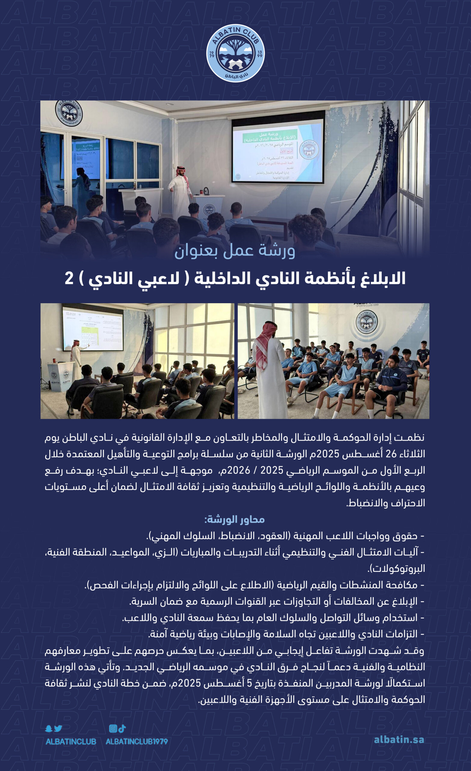 نظمت إدارة الحوكمة والامتثال والمخاطر بالتعاون مع الإدارة القانونية في نادي الباطن يوم الثلاثاء 26 أغسطس 2025م الورشة الثانية من سلسلة برامج التوعية والتأهيل المعتمدة خلال الربع الأول من الموسم الرياضي 2025 / 2026م، موجهة إلى لاعبي النادي؛ بهدف رفع وعيهم بالأنظمة واللوائح الرياضية والتنظيمية وتعزيز ثقافة الامتثال لضمان أعلى مستويات الاحتراف والانضباط.