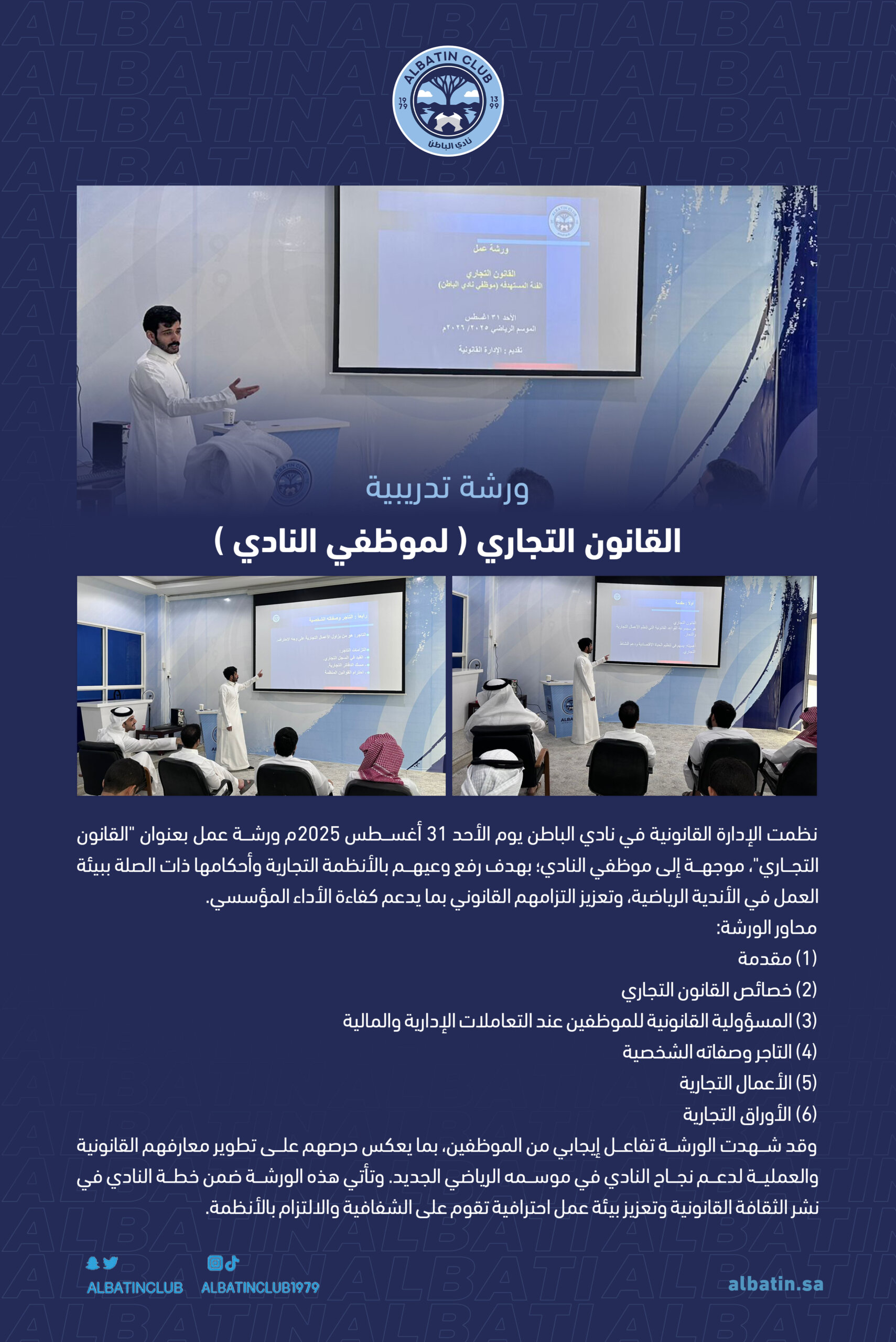 نظمت الإدارة القانونية في نادي الباطن يوم الأحد 31 أغسطس 2025م ورشة عمل بعنوان “القانون التجاري”، موجهة إلى موظفي النادي؛ بهدف رفع وعيهم بالأنظمة التجارية وأحكامها ذات الصلة ببيئة العمل في الأندية الرياضية، وتعزيز التزامهم القانوني بما يدعم كفاءة الأداء المؤسسي.