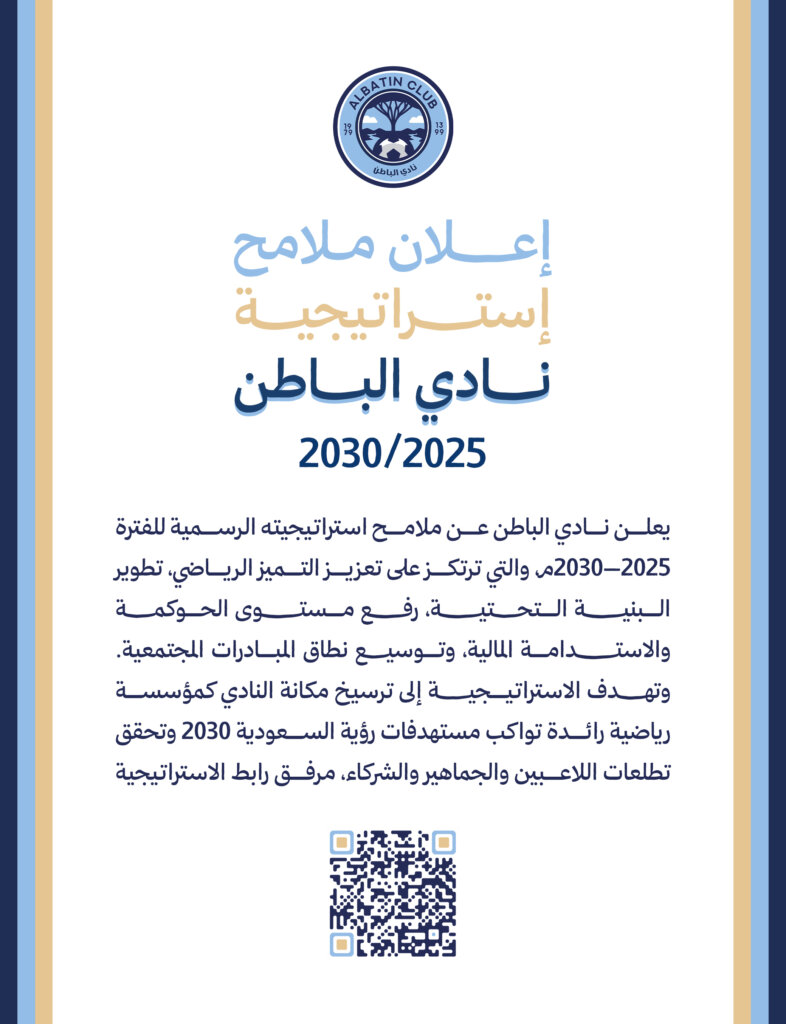 يعلن نادي الباطن عن ملامح استراتيجيته الرسمية للفترة 2025–2030م، والتي ترتكز على تعزيز التميز الرياضي، تطوير البنية التحتية، رفع مستوى الحوكمة والاستدامة المالية، وتوسيع نطاق المبادرات المجتمعية.