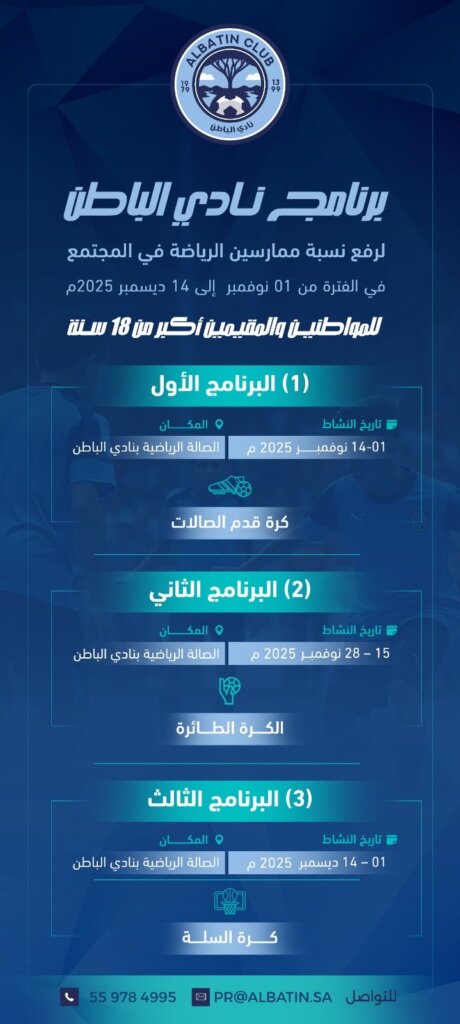 برنامج نادي الباطن الرياضي المجتمعي لرفع نسبة ممارسة الرياضة بين المواطنين والمقيمين أكبر من 18 سنة 23 أكتوبر، 2025 / اخبار النادي, برنامج نادي الباطن لرفع نسبة الممارسين للرياضة برنامج نادي الباطن الرياضي المجتمعي لرفع نسبة ممارسة الرياضة بين المواطنين والمقيمين أكبر من 18 سنة Share via: Facebook X (Twitter) LinkedIn More
