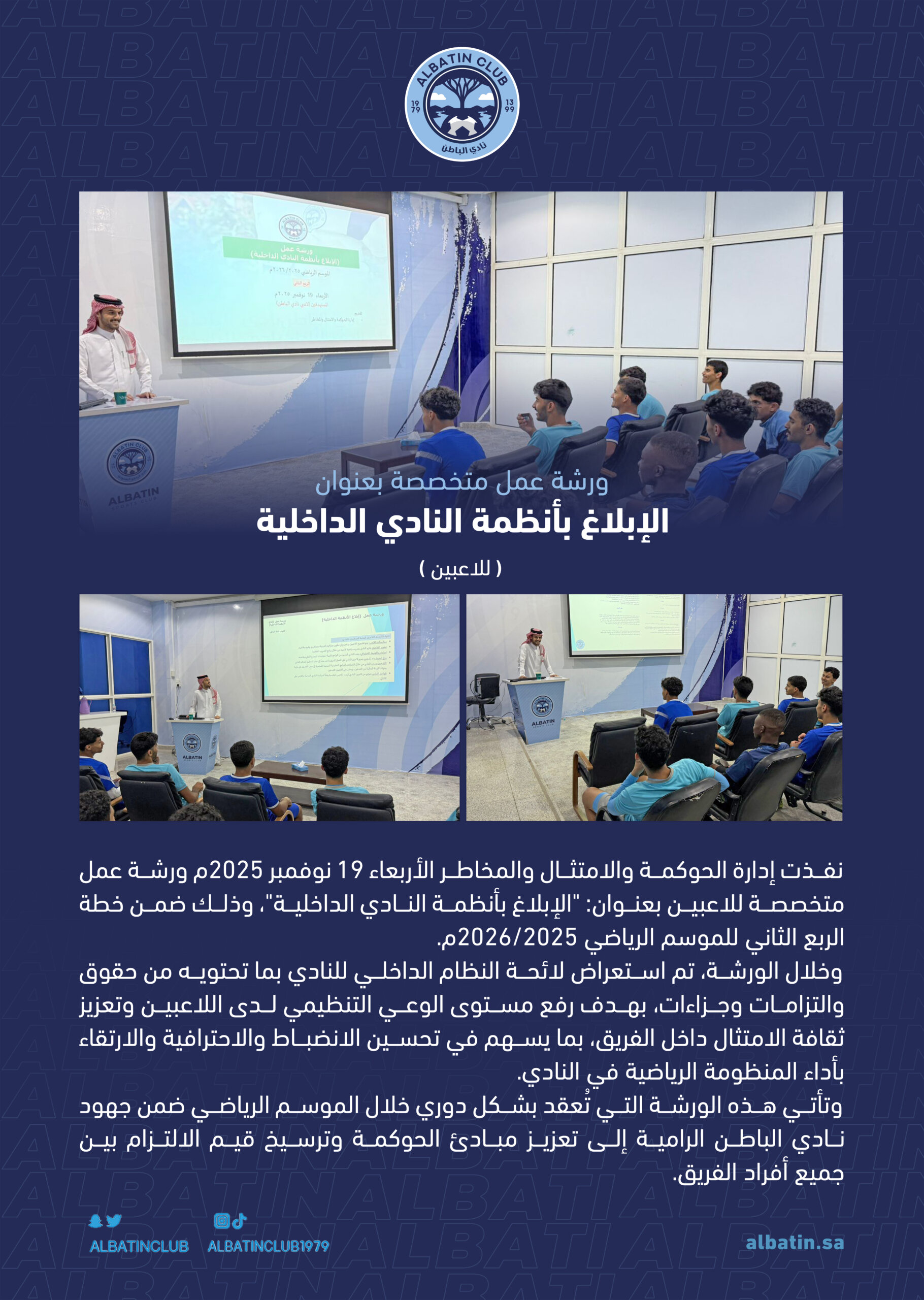 نفذت إدارة الحوكمة والامتثال والمخاطر الأربعاء 19 نوفمبر 2025م ورشة عمل متخصصة للاعبين بعنوان: “الإبلاغ بأنظمة النادي الداخلية”، وذلك ضمن خطة الربع الثاني للموسم الرياضي 2025/2026م.