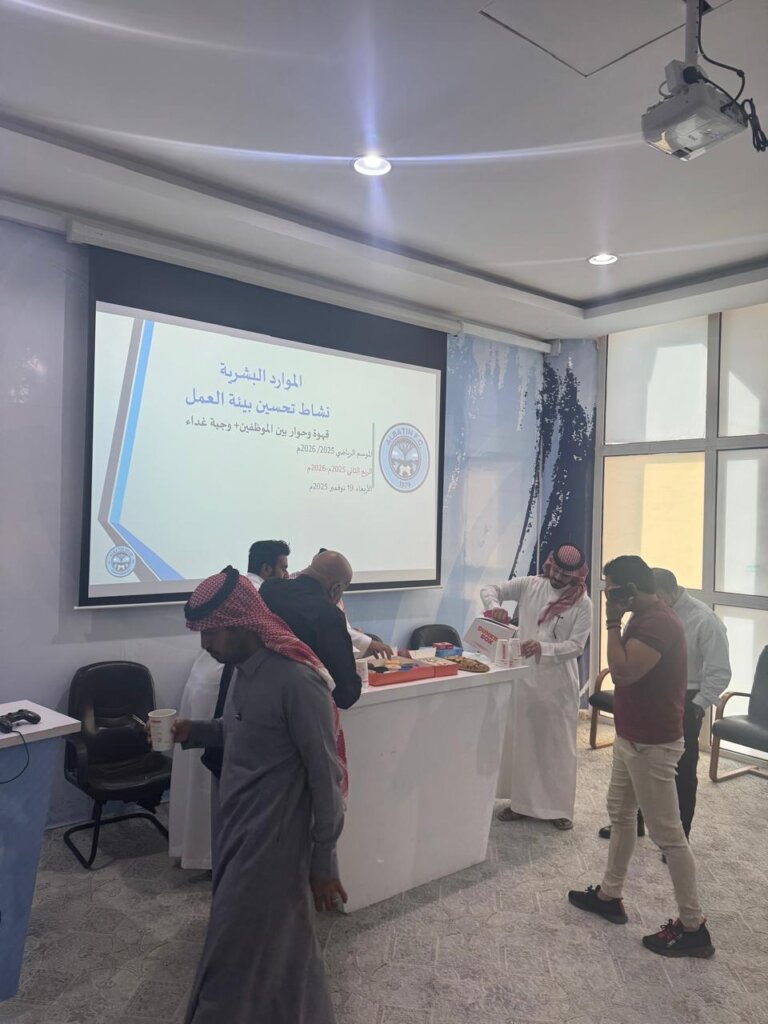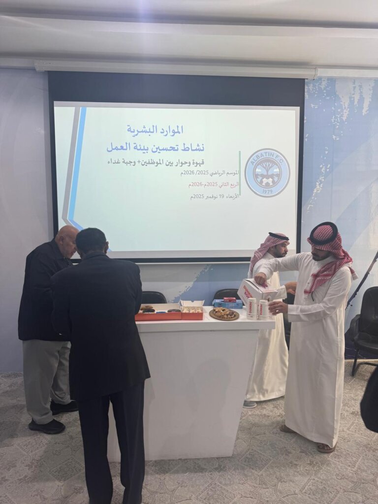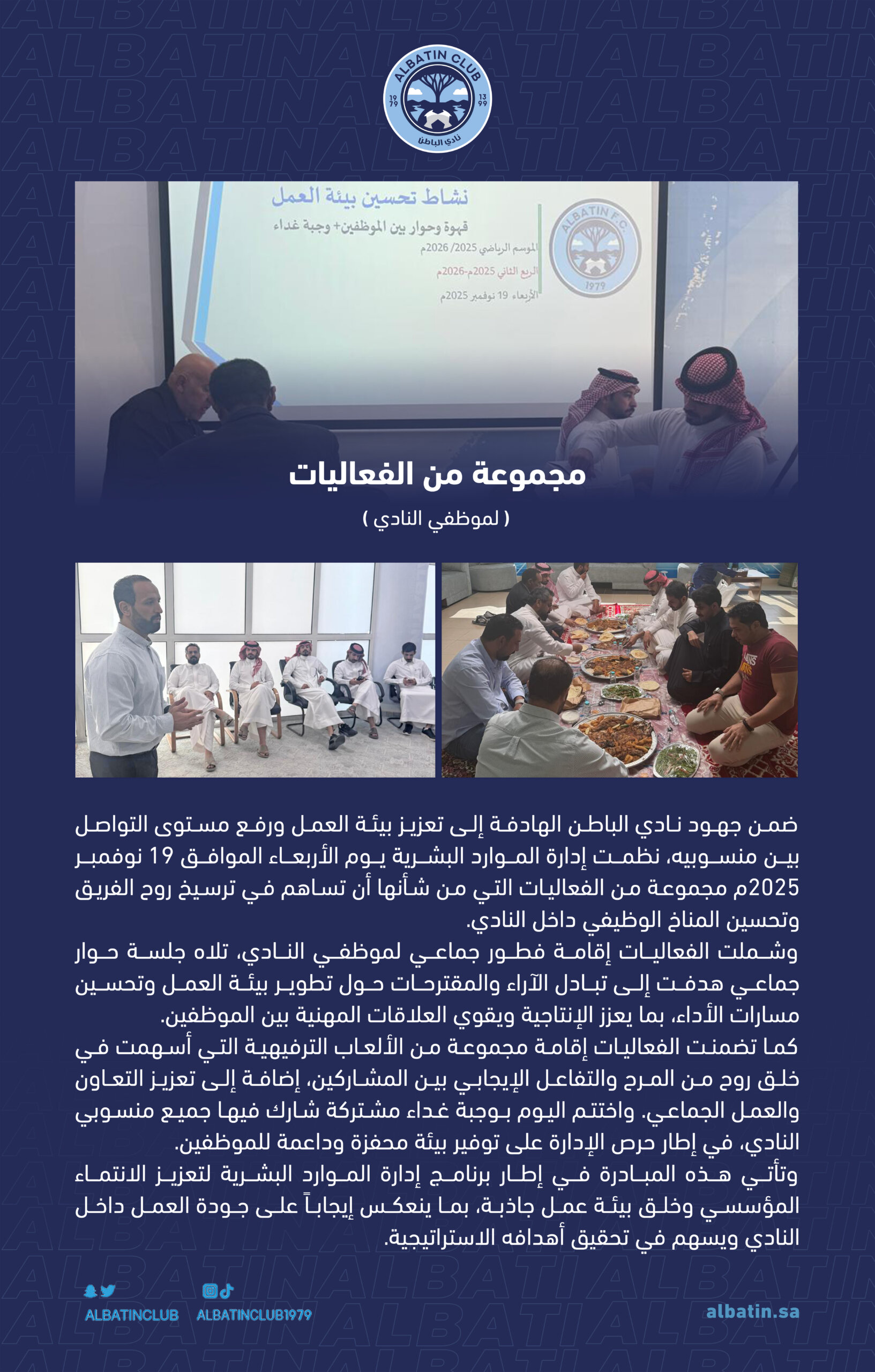 ضمن جهود نادي الباطن الهادفة إلى تعزيز بيئة العمل ورفع مستوى التواصل بين منسوبيه، نظمت إدارة الموارد البشرية يوم الأربعاء الموافق 19 نوفمبر 2025م مجموعة من الفعاليات التي من شأنها أن تساهم في ترسيخ روح الفريق وتحسين المناخ الوظيفي داخل النادي.