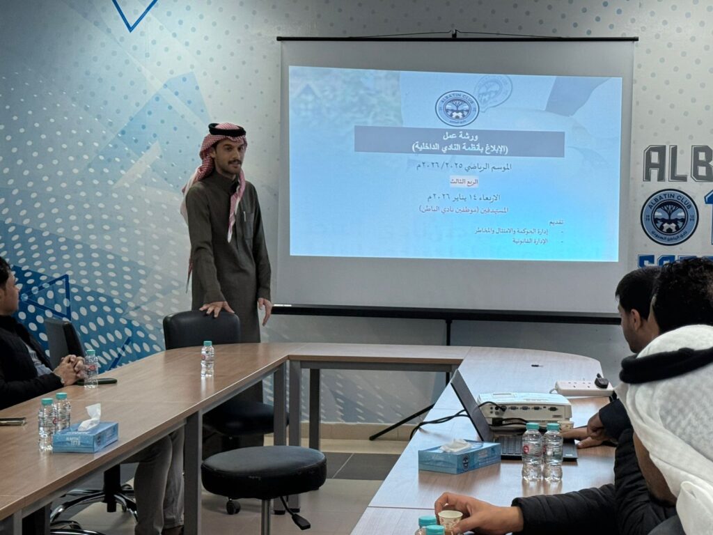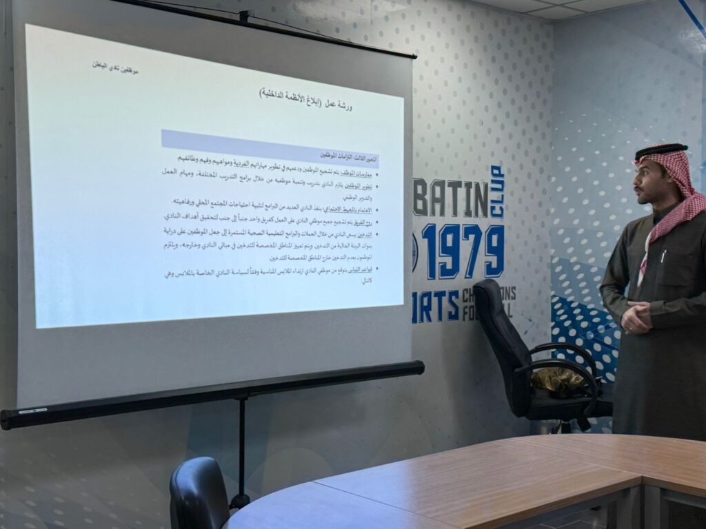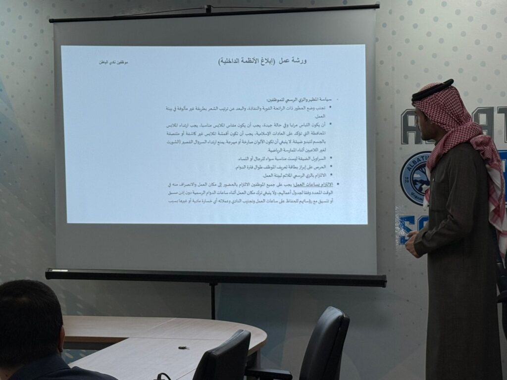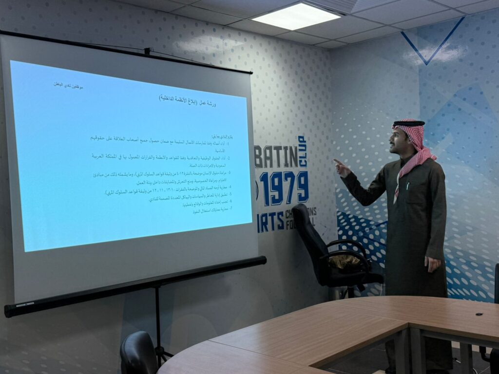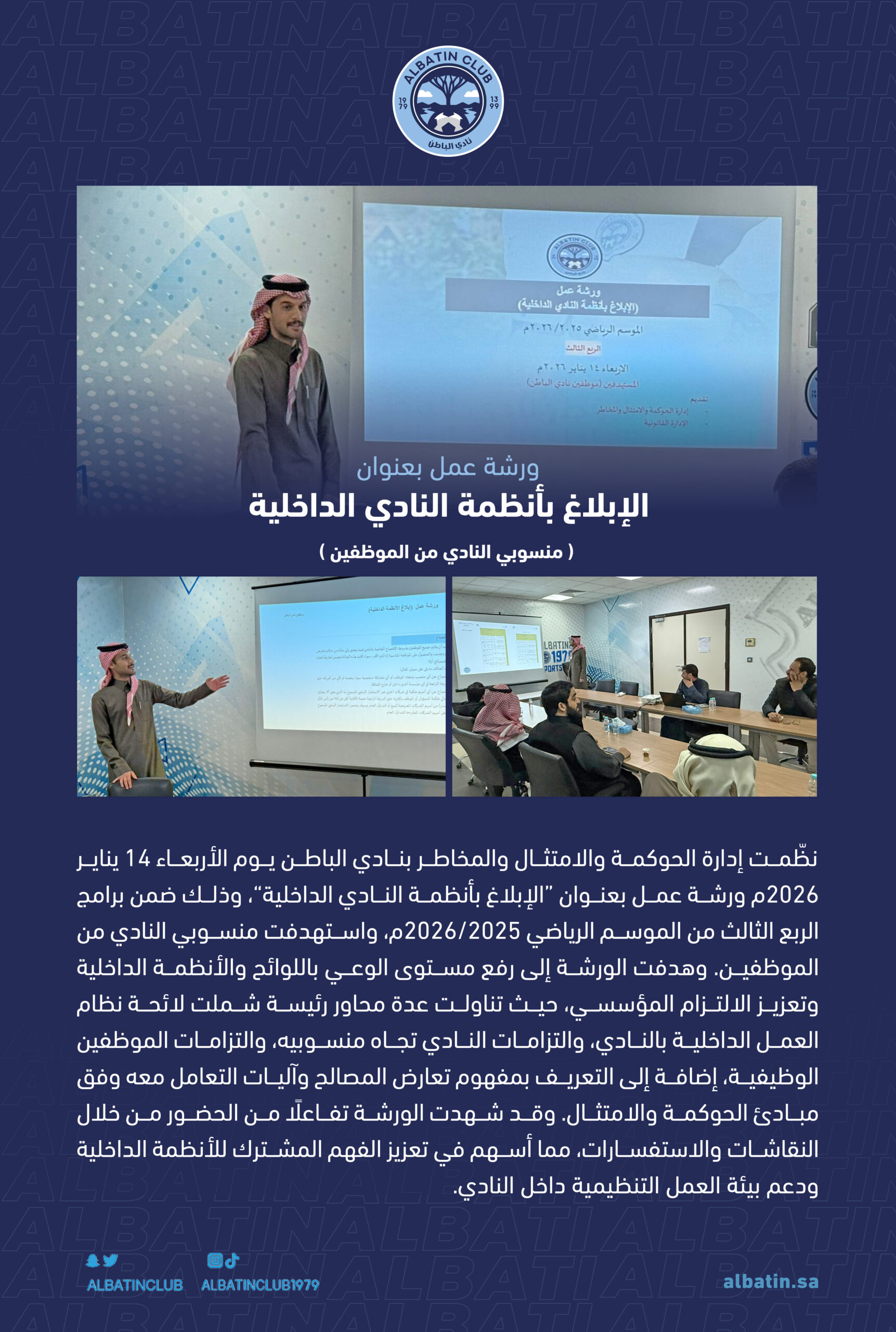 نظّمت إدارة الحوكمة والامتثال والمخاطر بنادي الباطن يوم الأربعاء 14 يناير 2026م ورشة عمل بعنوان “الإبلاغ بأنظمة النادي الداخلية”، وذلك ضمن برامج الربع الثالث من الموسم الرياضي 2025/2026م، واستهدفت منسوبي النادي من الموظفين. وهدفت الورشة إلى رفع مستوى الوعي باللوائح والأنظمة الداخلية وتعزيز الالتزام المؤسسي، حيث تناولت عدة محاور رئيسة شملت لائحة نظام العمل الداخلية بالنادي، والتزامات النادي تجاه منسوبيه، والتزامات الموظفين الوظيفية، إضافة إلى التعريف بمفهوم تعارض المصالح وآليات التعامل معه وفق مبادئ الحوكمة والامتثال. وقد شهدت الورشة تفاعلًا من الحضور من خلال النقاشات والاستفسارات، مما أسهم في تعزيز الفهم المشترك للأنظمة الداخلية ودعم بيئة العمل التنظيمية داخل النادي.
