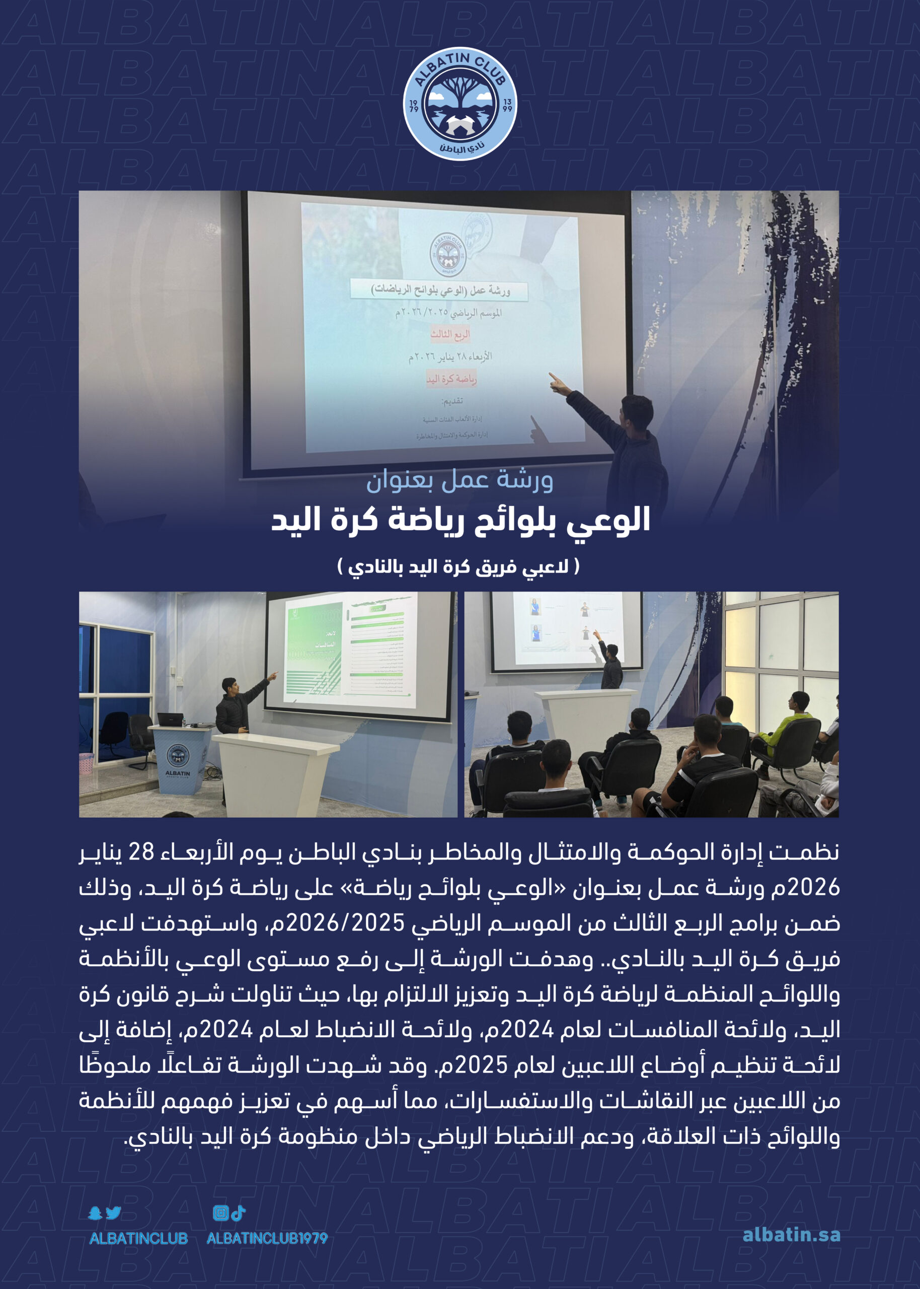 نظمت إدارة الحوكمة والامتثال والمخاطر بنادي الباطن يوم الأربعاء 28 يناير 2026م ورشة عمل بعنوان «الوعي بلوائح رياضة» على رياضة كرة اليد، وذلك ضمن برامج الربع الثالث من الموسم الرياضي 2025/2026م، واستهدفت لاعبي فريق كرة اليد بالنادي.. وهدفت الورشة إلى رفع مستوى الوعي بالأنظمة واللوائح المنظمة لرياضة كرة اليد وتعزيز الالتزام بها، حيث تناولت شرح قانون كرة اليد، ولائحة المنافسات لعام 2024م، ولائحة الانضباط لعام 2024م، إضافة إلى لائحة تنظيم أوضاع اللاعبين لعام 2025م. وقد شهدت الورشة تفاعلًا ملحوظًا من اللاعبين عبر النقاشات والاستفسارات، مما أسهم في تعزيز فهمهم للأنظمة واللوائح ذات العلاقة، ودعم الانضباط الرياضي داخل منظومة كرة اليد بالنادي.