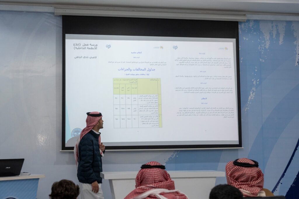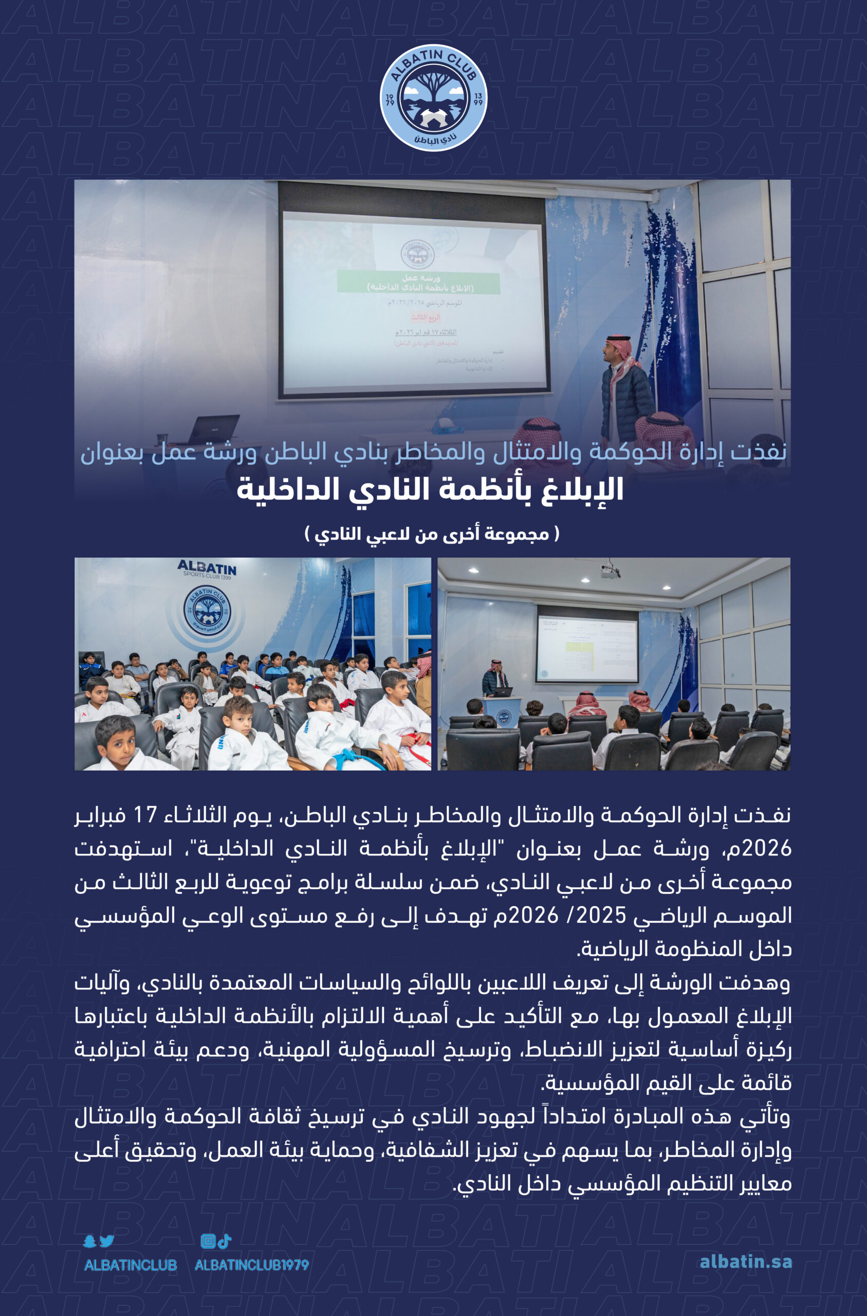 نفذت إدارة الحوكمة والامتثال والمخاطر بنادي الباطن، يوم الثلاثاء 17 فبراير 2026م، ورشة عمل بعنوان “الإبلاغ بأنظمة النادي الداخلية”، استهدفت مجموعة أخرى من لاعبي النادي، ضمن سلسلة برامج توعوية للربع الثالث من الموسم الرياضي 2025/ 2026م تهدف إلى رفع مستوى الوعي المؤسسي داخل المنظومة الرياضية.
