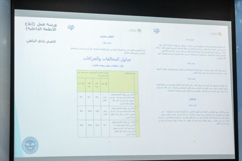 نفذت إدارة الحوكمة والامتثال والمخاطر بنادي الباطن ورشة عمل بعنوان الإبلاغ بأنظمة النادي الداخلية ( مجموعة أخرى من لاعبي النادي )
