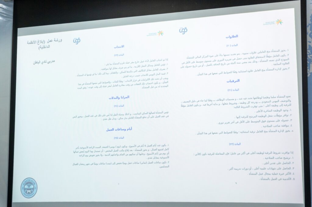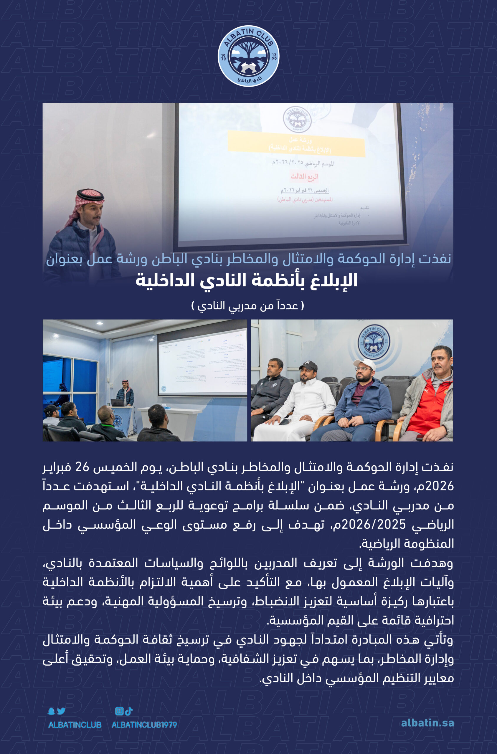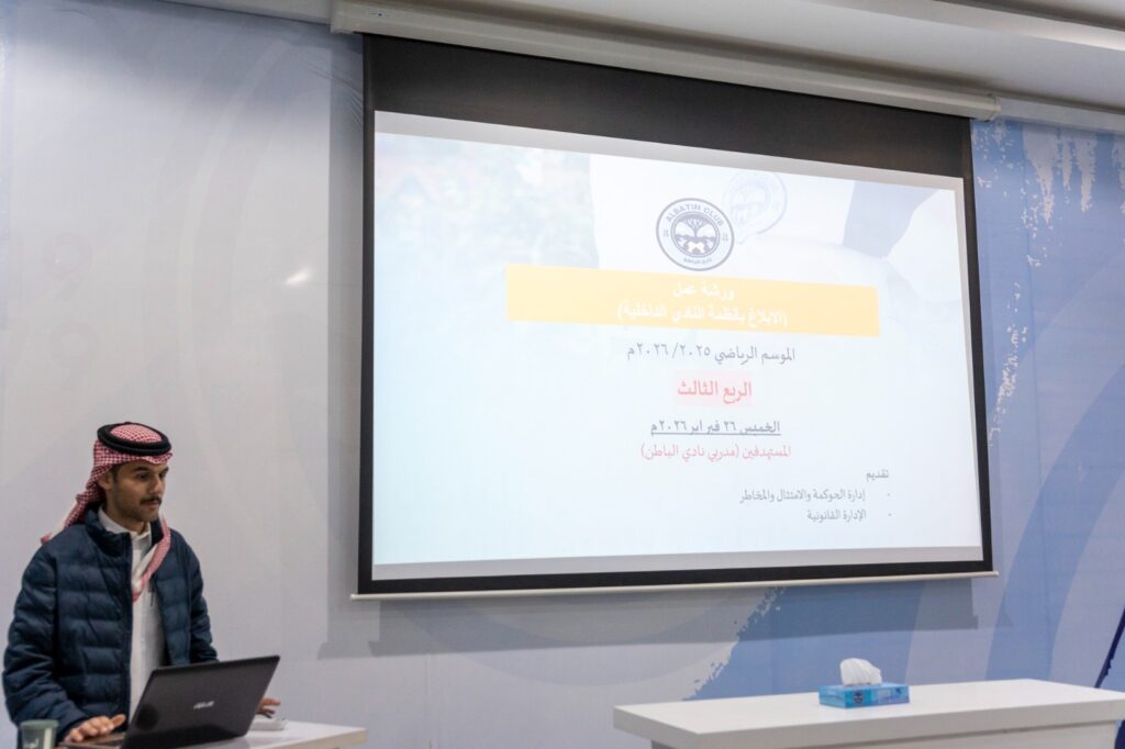 نفذت إدارة الحوكمة والامتثال والمخاطر بنادي الباطن، يوم الخميس 26 فبراير 2026م، ورشة عمل بعنوان “الإبلاغ بأنظمة النادي الداخلية”، استهدفت عدداً من مدربي النادي، ضمن سلسلة برامج توعوية للربع الثالث من الموسم الرياضي 2025/2026م، تهدف إلى رفع مستوى الوعي المؤسسي داخل المنظومة الرياضية.