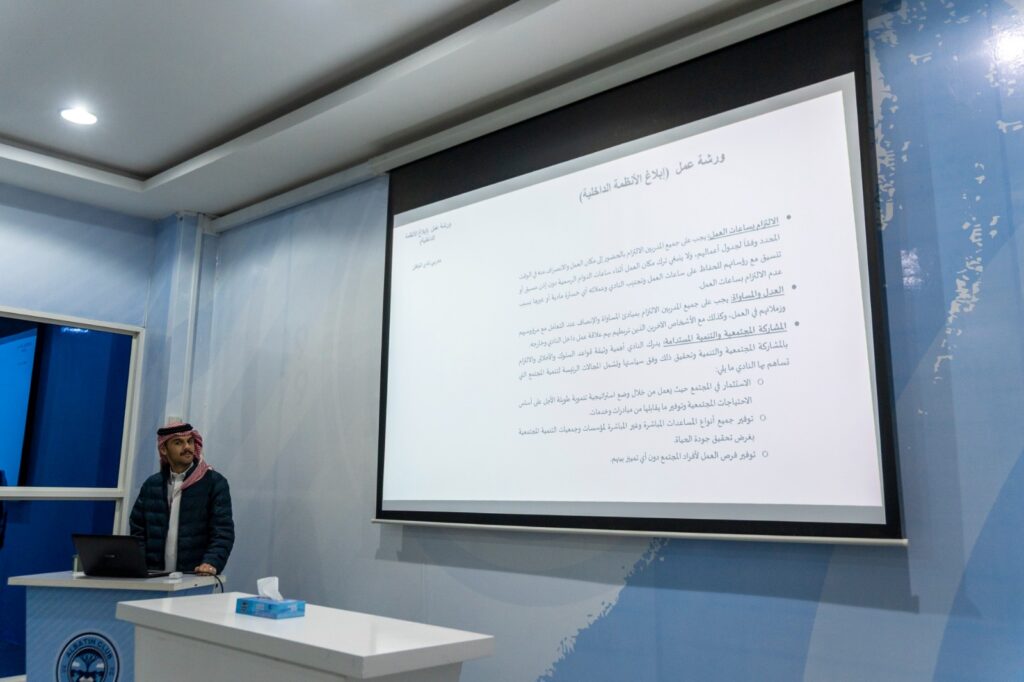 وهدفت الورشة إلى تعريف المدربين باللوائح والسياسات المعتمدة بالنادي، وآليات الإبلاغ المعمول بها، مع التأكيد على أهمية الالتزام بالأنظمة الداخلية باعتبارها ركيزة أساسية لتعزيز الانضباط، وترسيخ المسؤولية المهنية، ودعم بيئة احترافية قائمة على القيم المؤسسية.