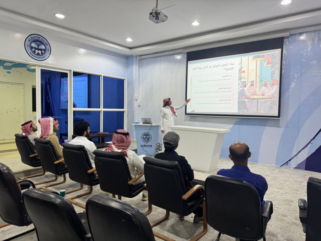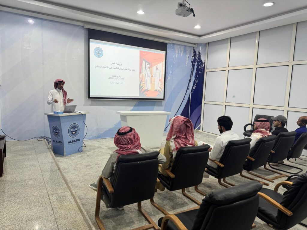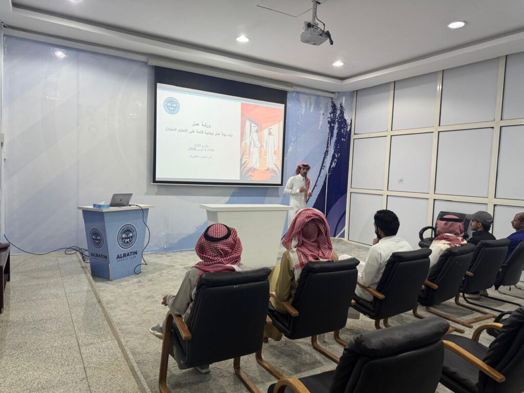 نفذت إدارة الموارد البشرية بنادي الباطن يوم 3 مارس 2026م ورشة عمل بعنوان “بناء بيئة عمل إيجابية قائمة على الاحترام المتبادل” استهدفت موظفي النادي، وذلك في إطار جهود الإدارة لتعزيز بيئة العمل الإيجابية وتطوير ثقافة الاحترام والتعاون بين منسوبي النادي.