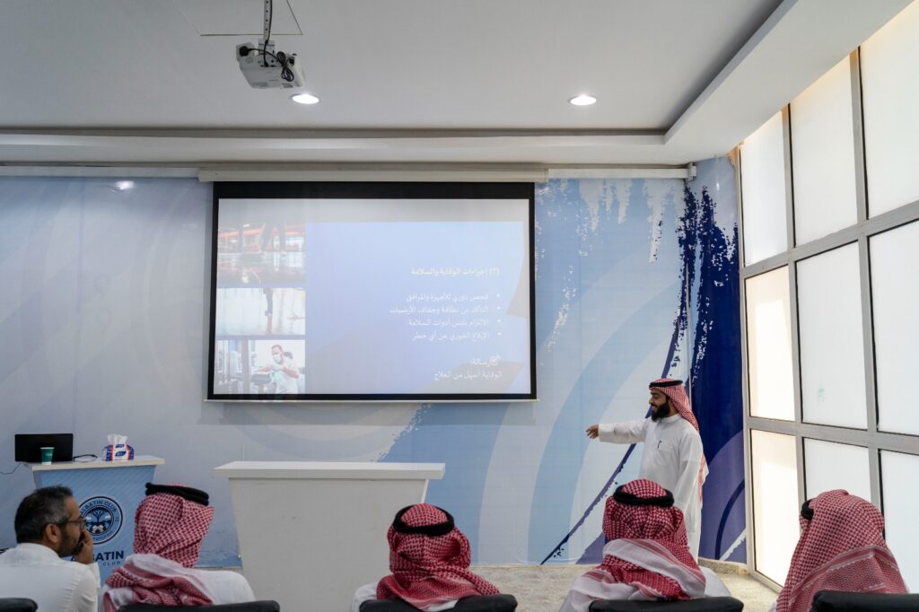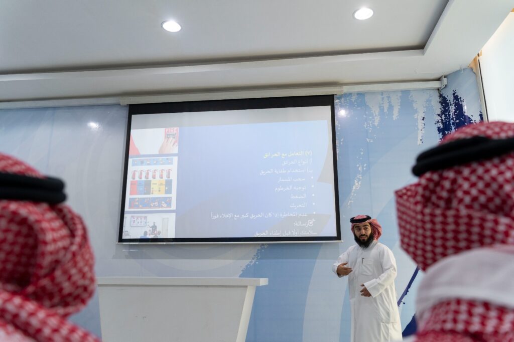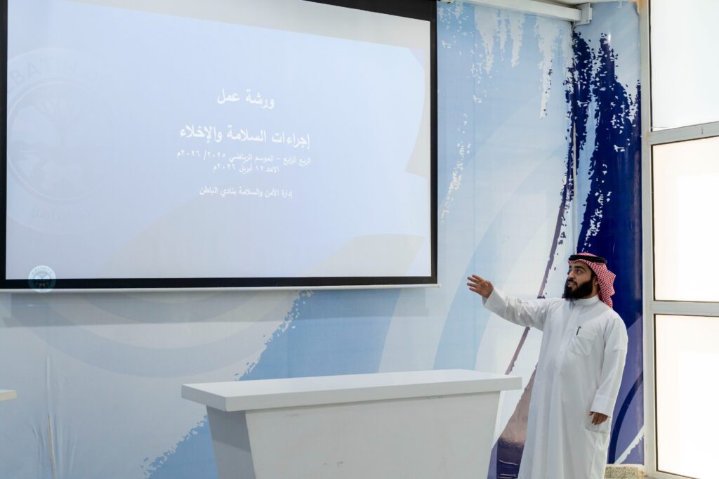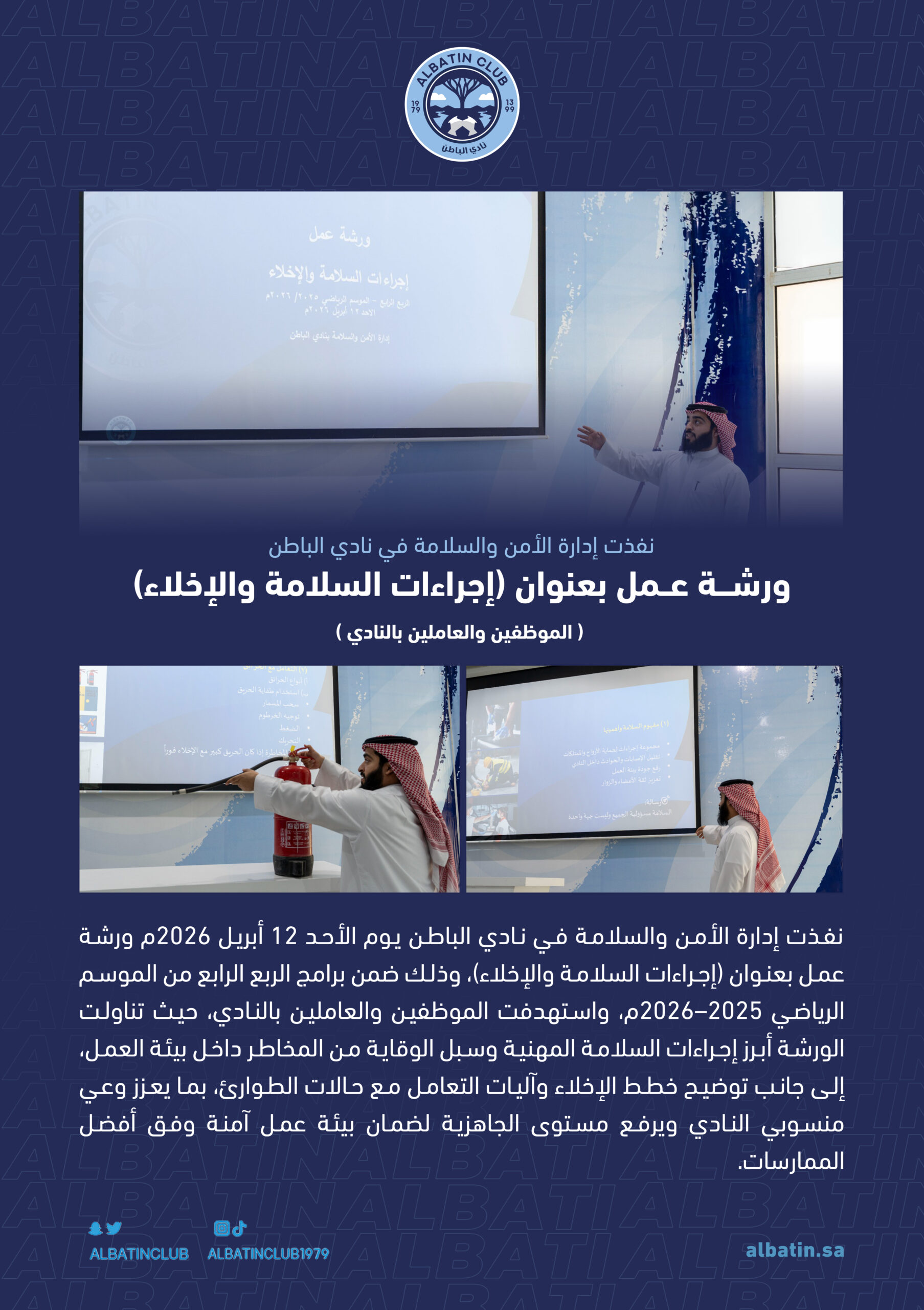 نفذت إدارة الأمن والسلامة في نادي الباطن يوم الأحد 12 أبريل 2026م ورشة عمل بعنوان (إجراءات السلامة والإخلاء)، وذلك ضمن برامج الربع الرابع من الموسم الرياضي 2025–2026م، واستهدفت الموظفين والعاملين بالنادي، حيث تناولت الورشة أبرز إجراءات السلامة المهنية وسبل الوقاية من المخاطر داخل بيئة العمل، إلى جانب توضيح خطط الإخلاء وآليات التعامل مع حالات الطوارئ، بما يعزز وعي منسوبي النادي ويرفع مستوى الجاهزية لضمان بيئة عمل آمنة وفق أفضل الممارسات.
