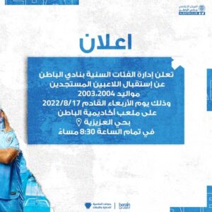 تعلن إدارة الفئات السنية بنادي الباطن عن إستقبال اللاعبين المستجدين من مواليد 2003 ، 2004 ، وذلك يوم الأربعاء القادم 17/8/2022 على ملعب أكاديمية الباطن بحي العزيزية في تمام الساعة 8،30 مساءً