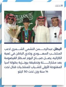 بعد تحقيقه برونزية آسيا .. بطل المنتخب والسماوي للكاراتيه عبدالرحمن الشمري يصل حفرالباطن