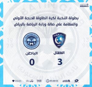 خسارة نادي الباطن لكرة الطاولة من نظيرة الهلال بنتيجة 3-0 في المباراة التي جمعت بينهما ضمن منافسات بطولة النخبة