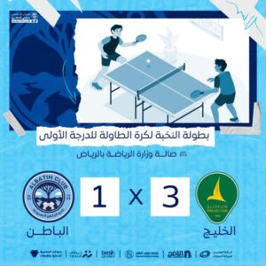 خسارة نادي الباطن لكرة الطاولة من نظيرة الخليج بنتيجة 3-1 في المباراة التي جمعت بينهما ضمن منافسات بطولة النخبة
