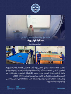 نظمت إدارةالفعاليات بنادي الباطن فعالية ترفيهية ( العاملين بالنادي ) نظمت إدارة الفعاليات بنادي الباطن يوم الأحد 15مارس 2026م فعالية ترفيهية للعاملين بالنادي، تضمنت عدداً من الأنشطة الرياضية الخفيفة، من بينها البلياردو وكرة الطاولة وكرة السلة، وذلك ضمن الأنشطة الترفيهية والفعاليات غير المصاحبة للمباريات خلال الربع الثالث من الموسم الرياضي 2025- 2026موتأتي هذه الفعالية ضمن