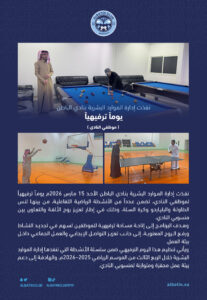 نفذت إدارة الموارد البشرية بنادي الباطن يوماً ترفيهياً ( موظفي النادي ) نفذت إدارة الموارد البشرية بنادي الباطن الأحد 15 مارس 2026م يوماً ترفيهياً لموظفي النادي، تضمن عدداً من الأنشطة الرياضية التفاعلية، من بينها تنس الطاولة والبلياردو وكرة السلة، وذلك في إطار تعزيز روح الألفة والتعاون بين منسوبي النادي.وهدف البرنامج إلى إتاحة مساحة ترفيهية للموظفين